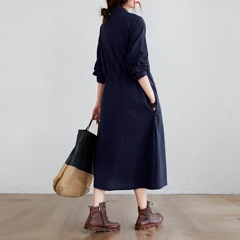 シャツワンピース ワンピース ナチュラル レディース 春 秋 ロング ひざ下丈 長袖 襟付き ボタン ウエストリボン 個性的 普段着 紺 ネイビー 茶色 ブラウン 大人可愛い きれいめ