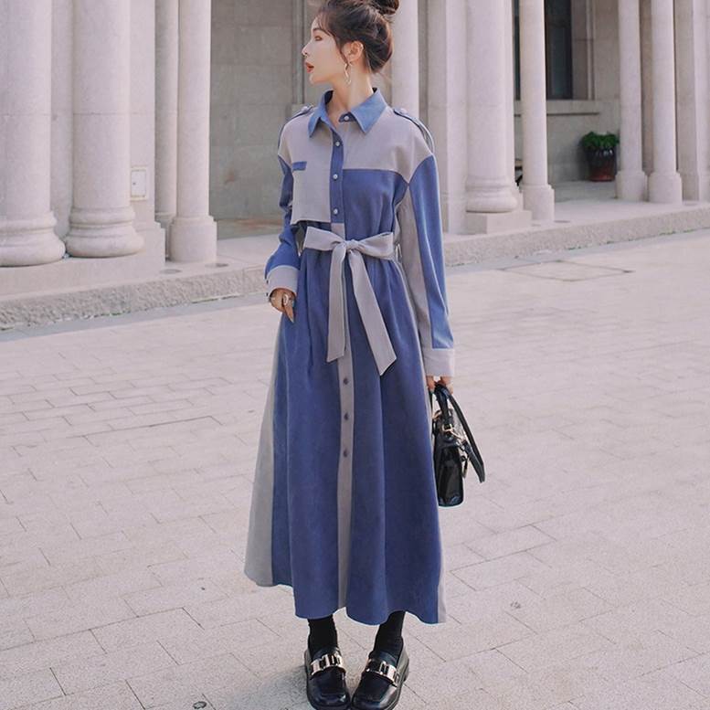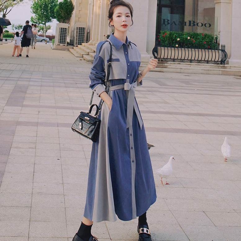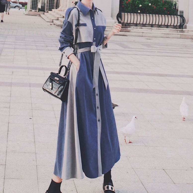 ワンピース シャツワンピ レディース 春 秋 バイカラー ロング丈 フレア 襟付き 長袖 ボタン ウエストリボン 個性的 トレンチ ミモレ丈 大人可愛い きれいめ 上品 エレガント