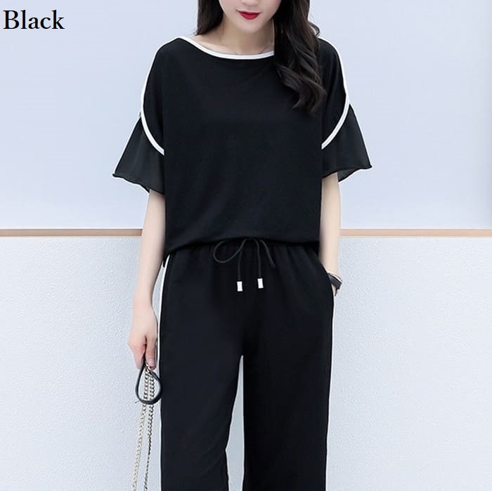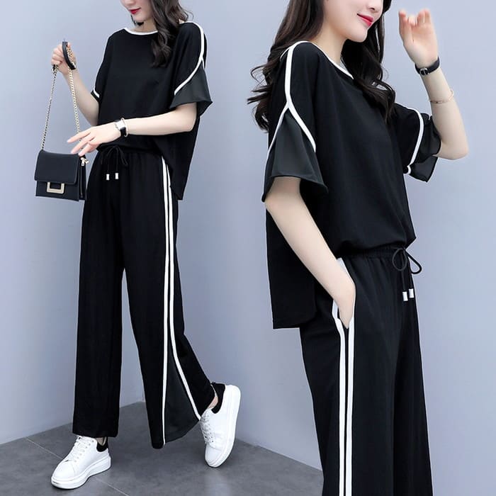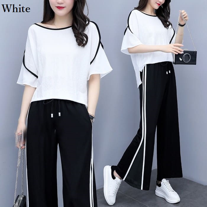 きれいめ レディース 韓国 春夏 大きいサイズ L~4XL セットアップ 上下セット 2点セット サイドライン スポーティー カジュアル ブラウス ボートネック 五分袖 半袖 パンツ ワイドパンツ ウ