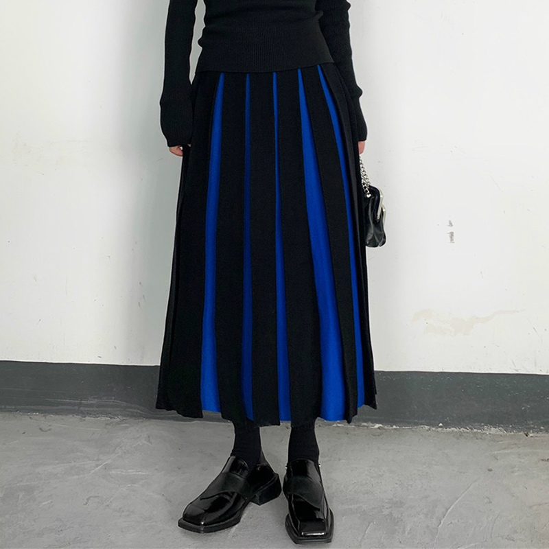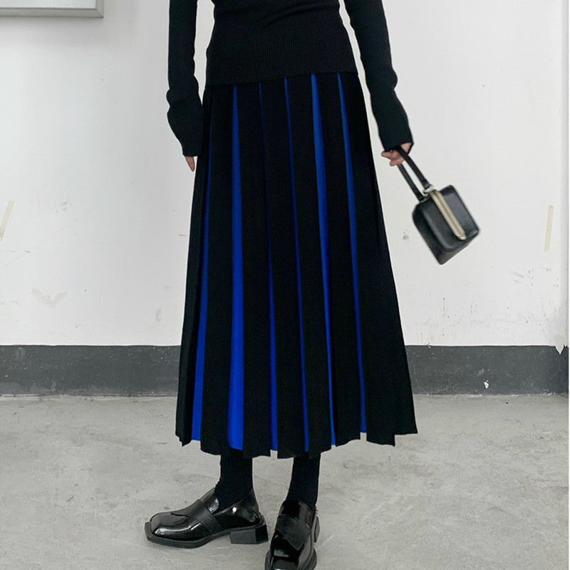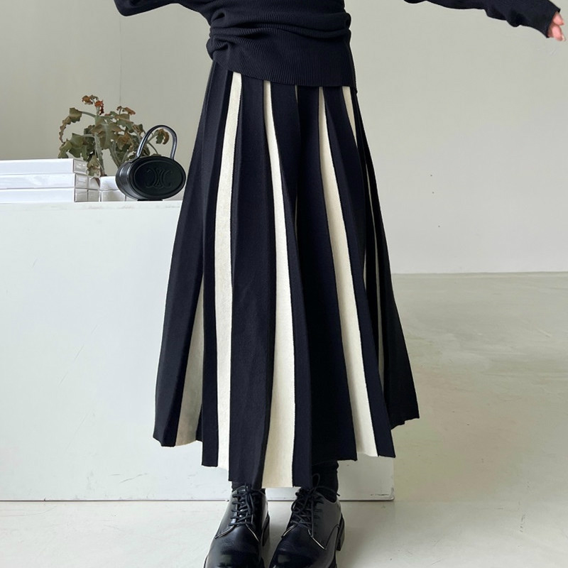 スカート ロング丈 ロングスカート ニット ニットスカート Aライン フレア プリーツ ギャザー 秋 冬 ストライプ レディース 暖かい 30代 40代 50代 ホワイト ブラック ブルー 体型カバー