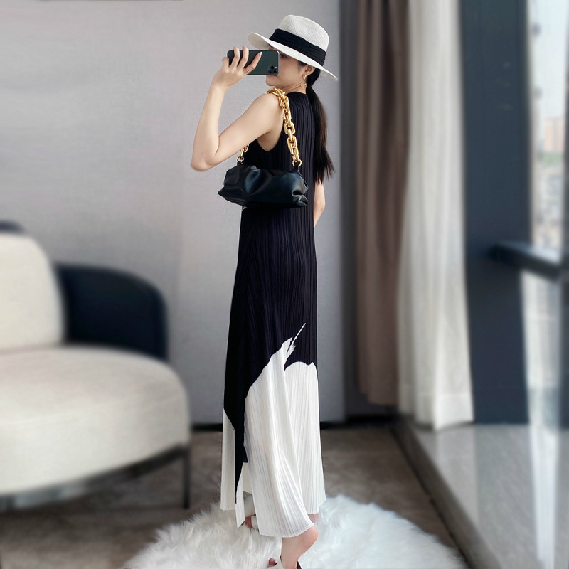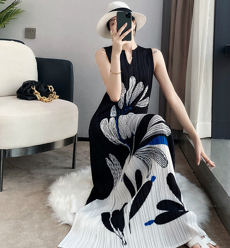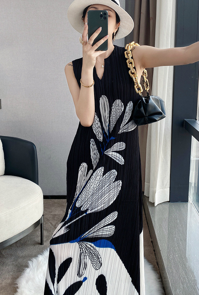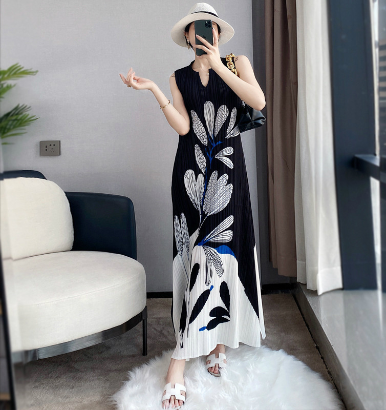ワンピース マキシ丈ワンピース ロング ロング丈 マキシ丈 ノースリーブ リゾートワンピース プリーツ 花柄 ヘンリーネック リゾート 海 旅行 細見え 縦長効果 ビーチ 大人かわいい 上品 ブラック