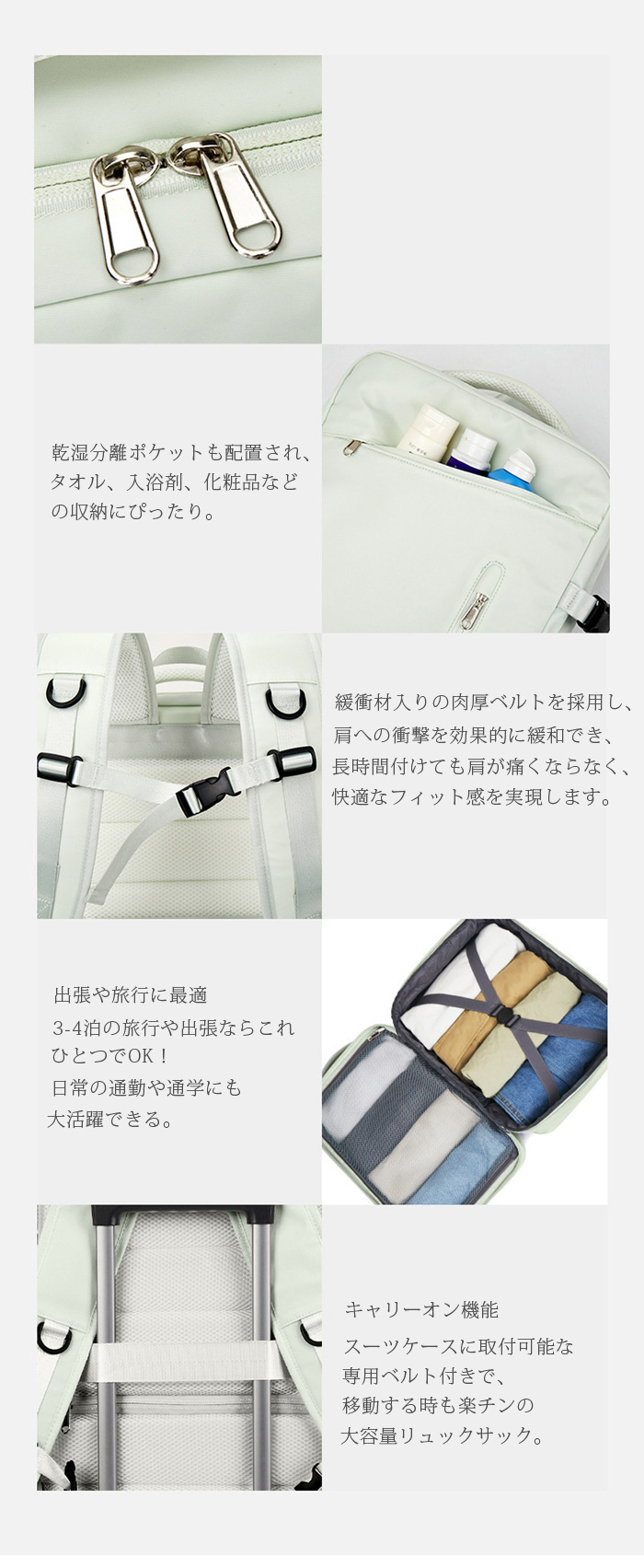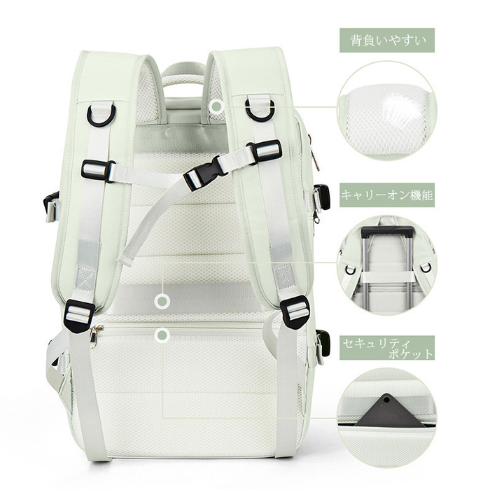 【キャリーオン機能】スーツケースに取付可能な専用ベルト付きで、移動する時も楽チンの大容量リュックサック。