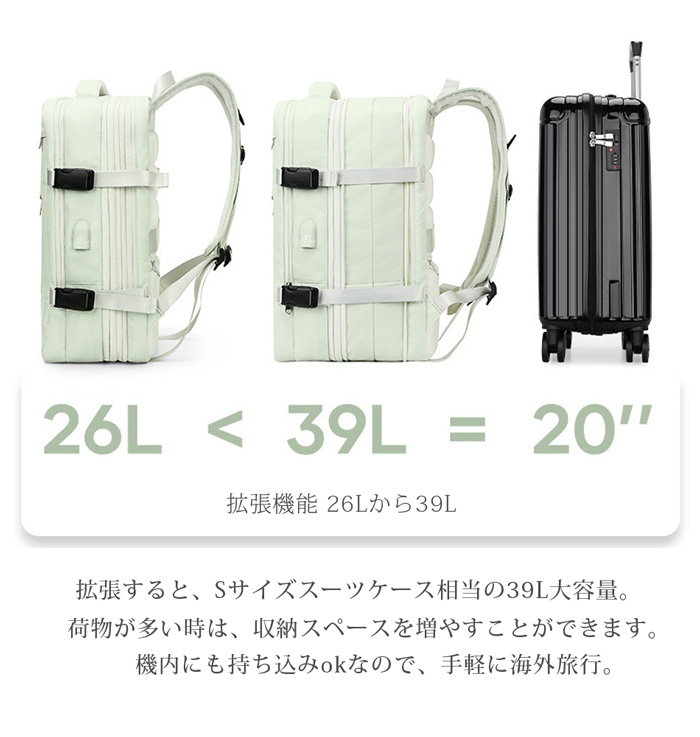 【スーツケース並みの収納力】拡張すると、Sサイズスーツケース相当の39L大容量。荷物が多い時は、収納スペースを増やすことができます。機内にも持ち込みokなので、手軽に海外旅行。