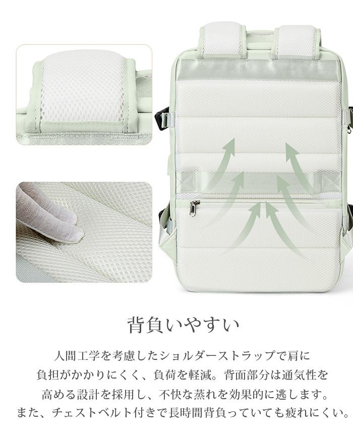 【背負いやすい】人間工学を考慮したショルダーストラップで肩に負担がかかりにくく、負荷を軽減。背面部分は通気性を高める設計を採用し、不快な蒸れを効果的に逃します。また、チェストベルト付きで長時間背負っていても疲れにくい。