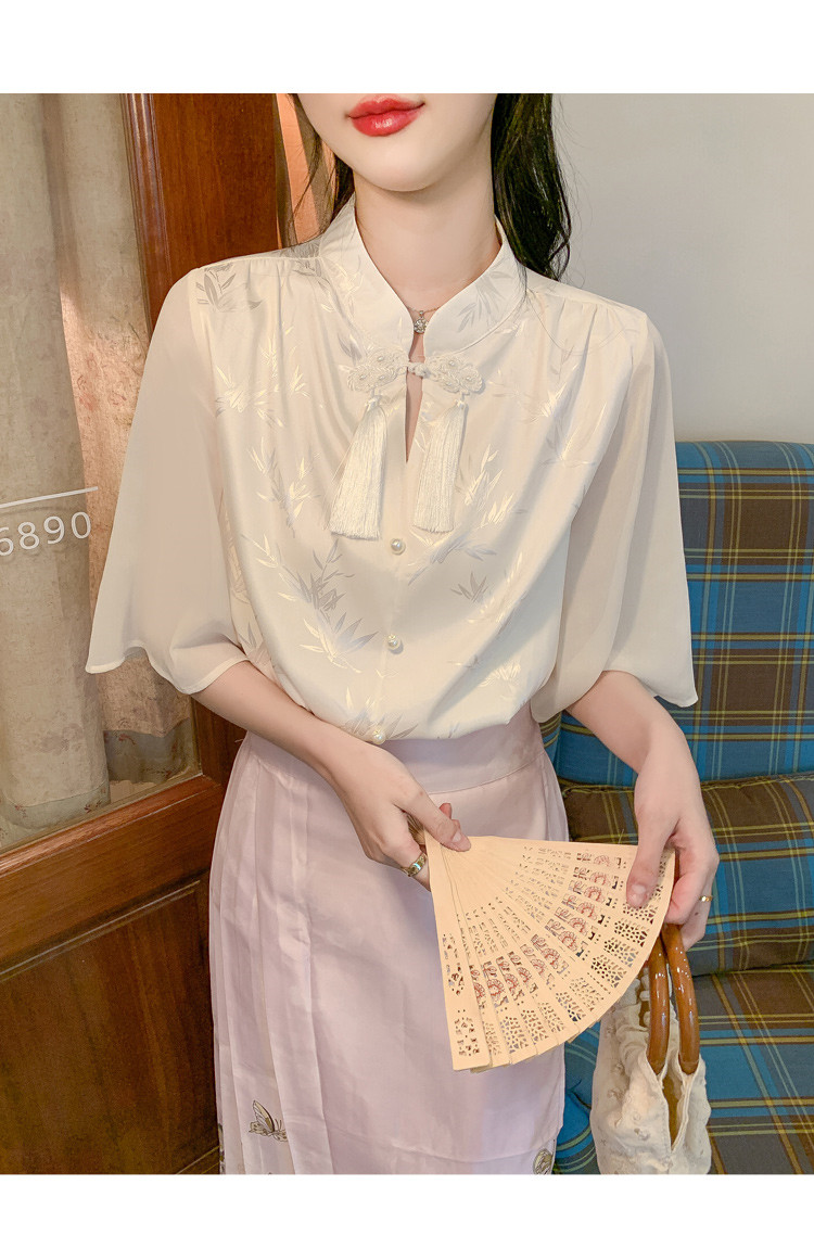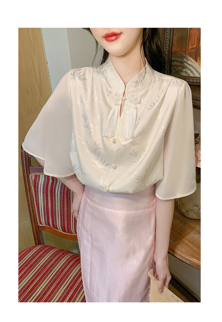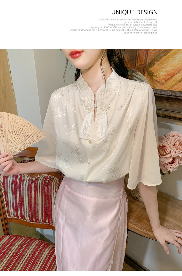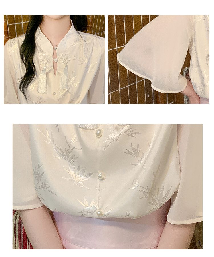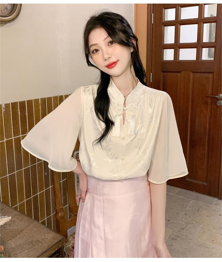 商品名 シャツ レディース チャイナ ブラウス フレア袖 ジャカード バンドカラー フェミニン おしゃれ 夏 中華風