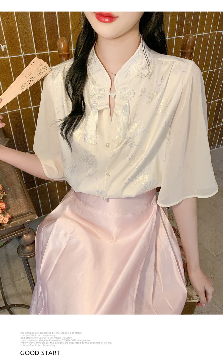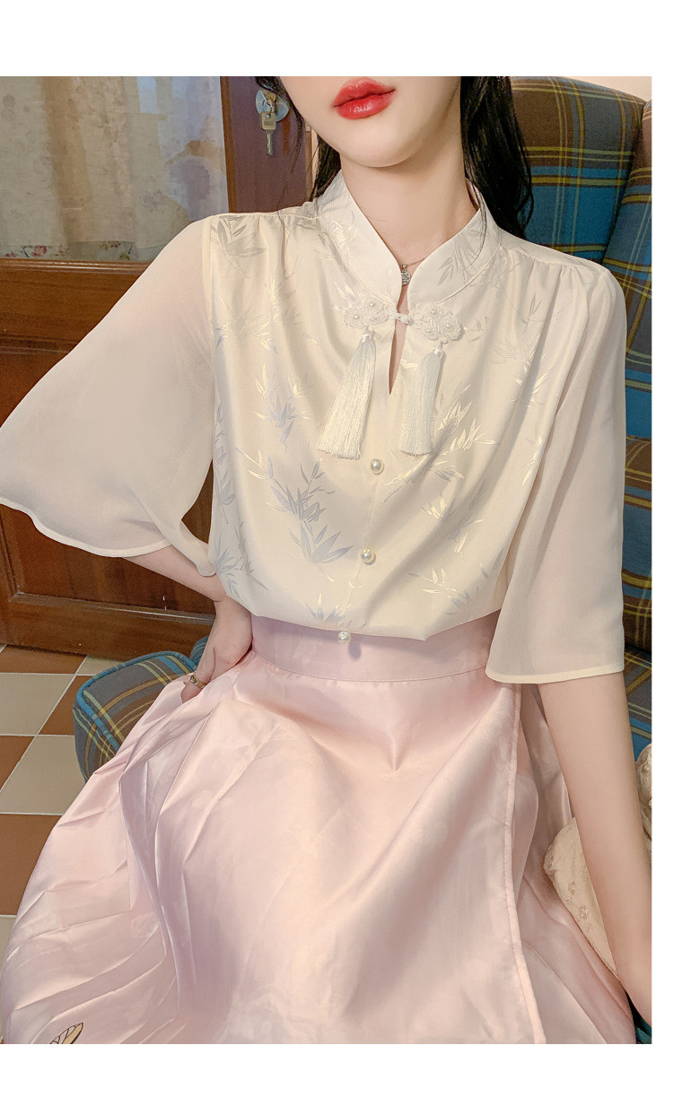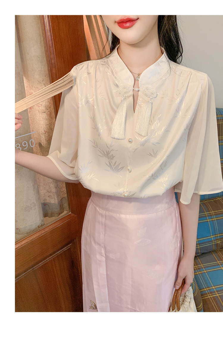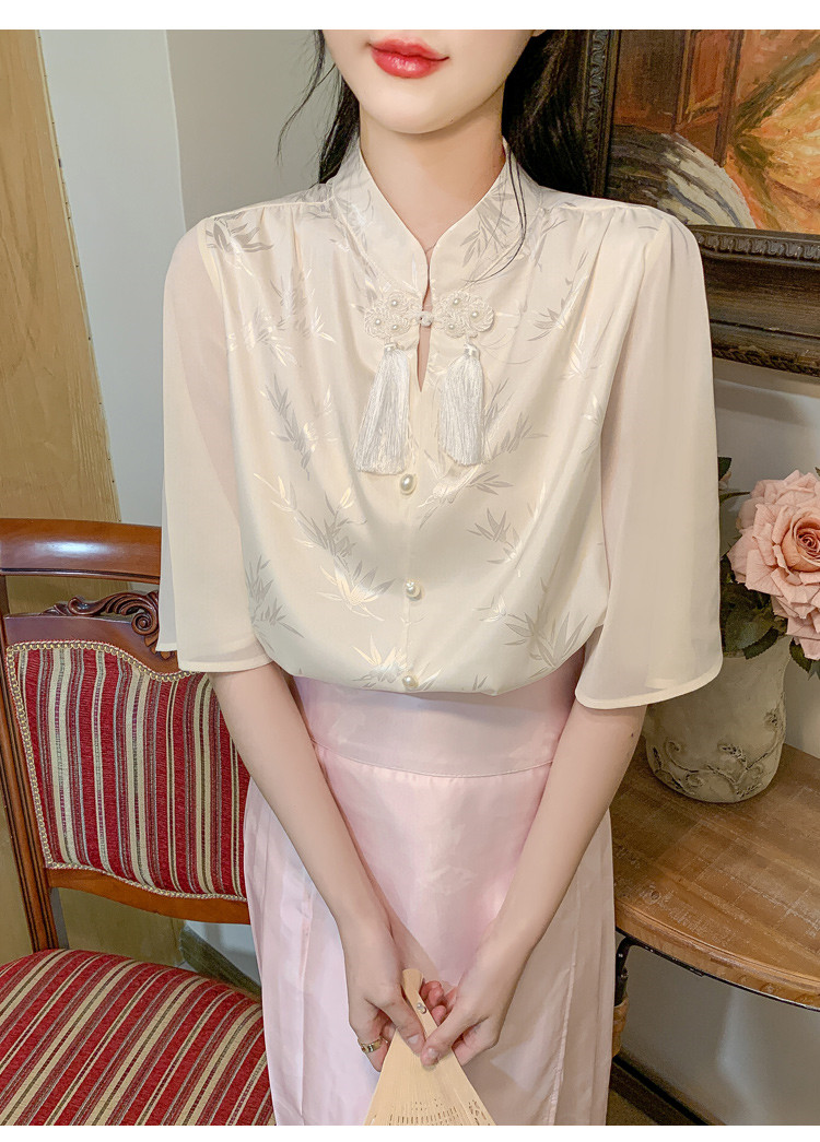 商品名 シャツ レディース チャイナ ブラウス フレア袖 ジャカード バンドカラー フェミニン おしゃれ 夏 中華風