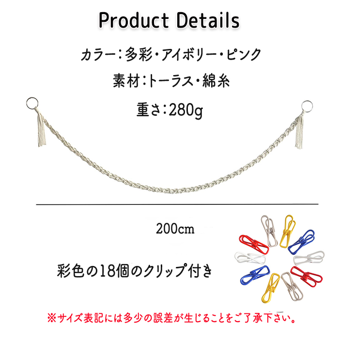 多彩・ピンク・アイボリーの3色で可愛い色合いのロープに18個のクリップ付きでさらに可愛く飾れます!