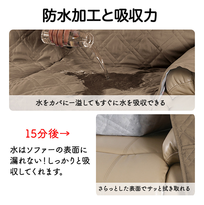 防水加工で濡れてもサッと拭き取れば元通り!水を吸収するのでソファーが濡れる心配もありません。