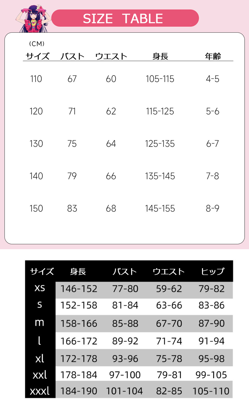 Key1: 110 120 130 140 150 XS S M L XL XXL XXXL