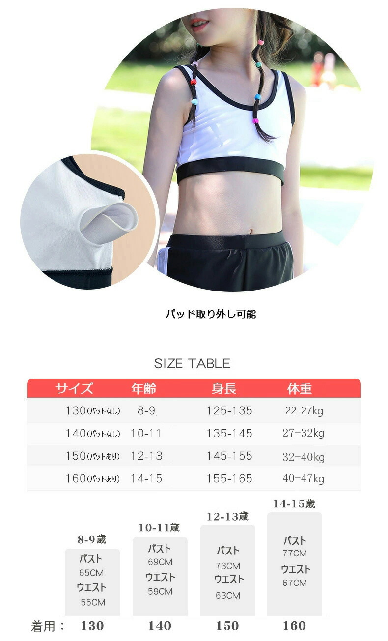 vertical-key: 130:125-135cm (パットなし) 140:135-145cm(パットなし) 150:145-155cm (パットあり) 160:155-165cm (パットあり)
