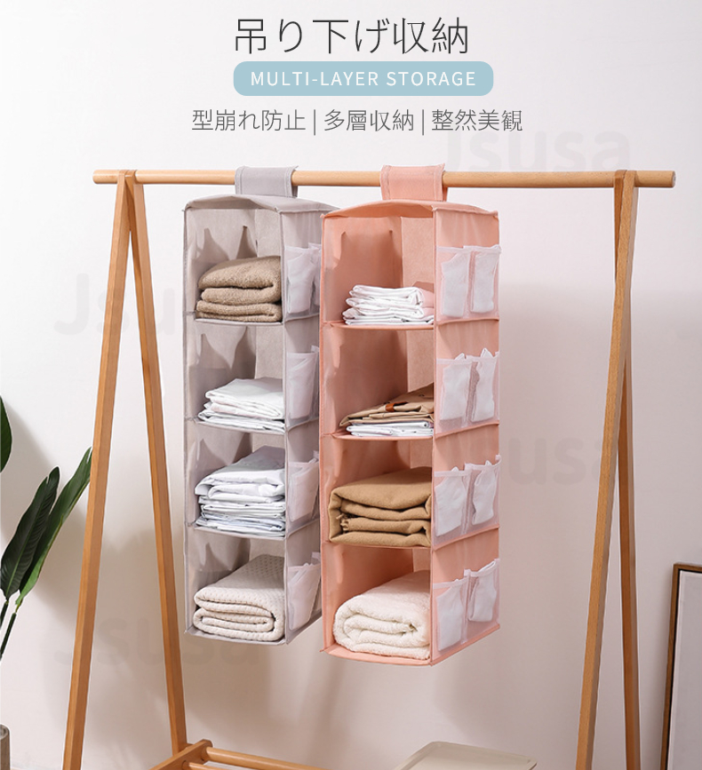 クローゼットなどのスペースを有効活用できる便利な吊り下げ式収納袋。