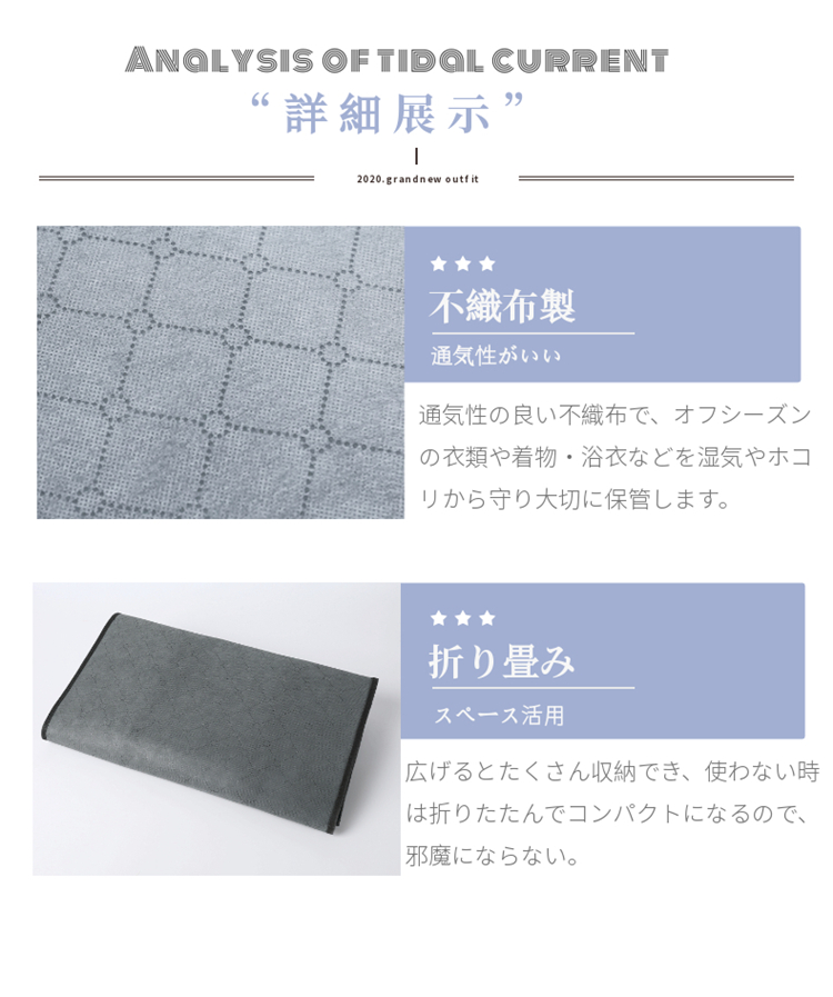 通気性の良い不織布で、オフシーズンの衣類や着物・浴衣などを湿気やホコリから守り大切に保管。