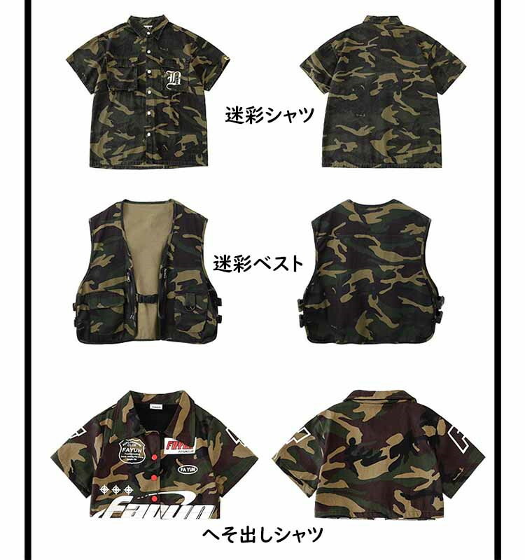 vertical-key: 黒シャツ単品 白シャツ単品 黒タンクトップ単品 迷彩ベスト単品 迷彩短ズボン単品 迷彩長ズボン単品 迷彩シャツ単品 へそ出し迷彩シャツ単品