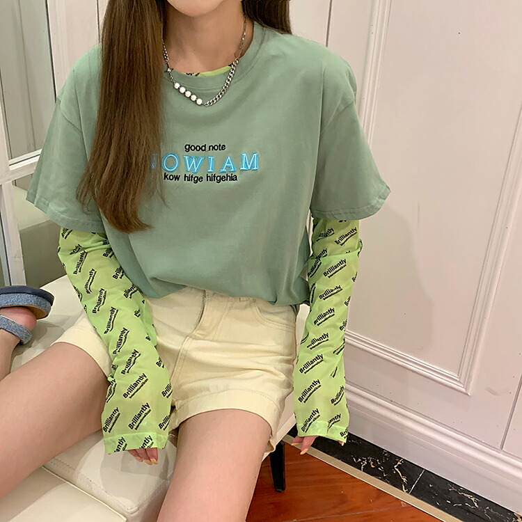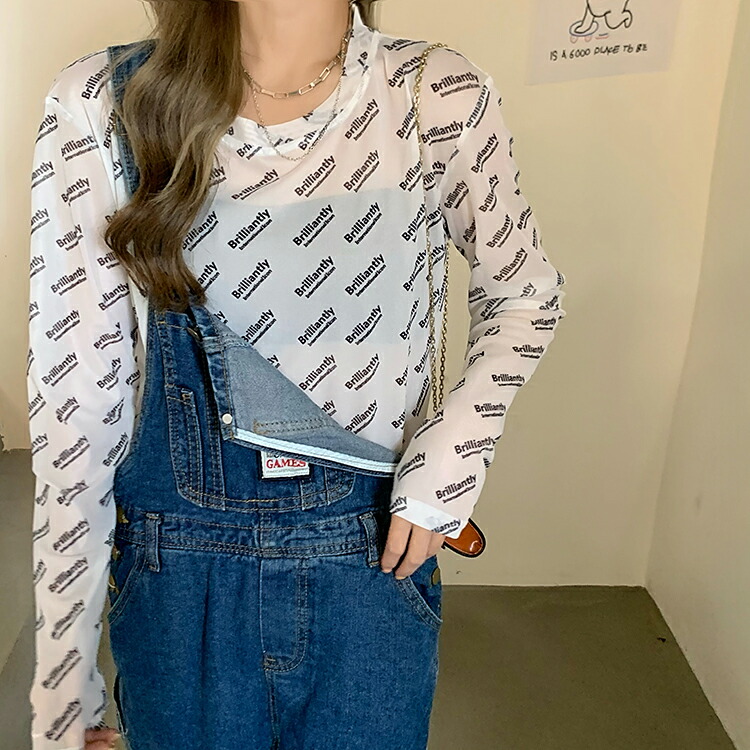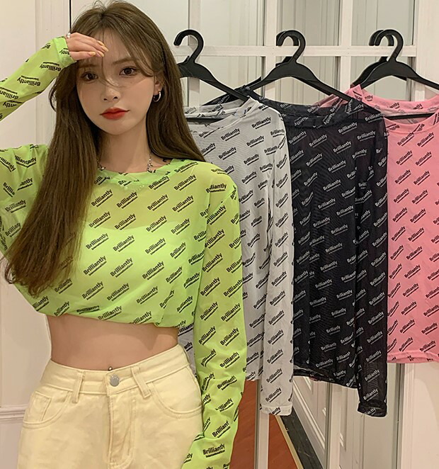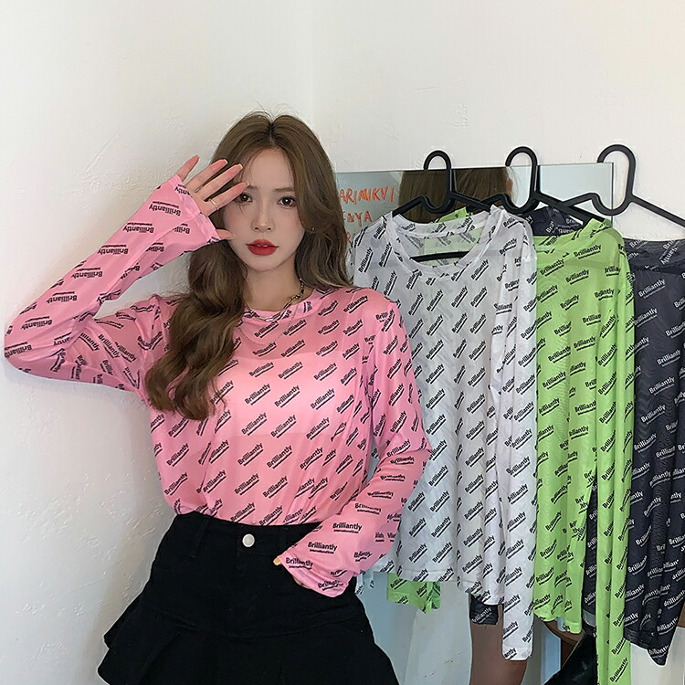 シースルー ロゴ トップス カットソー 長袖 透け感 Tシャツ インナー 薄手 ダンス 衣装 ヒップホップ HIPHOP レディース ガールズ ストリート カラフル 個性的 奇抜 派手 総柄 蛍光色 韓国 おしゃれ かっこいい 白 黒 緑 ピンク