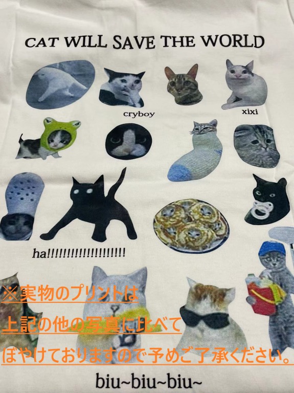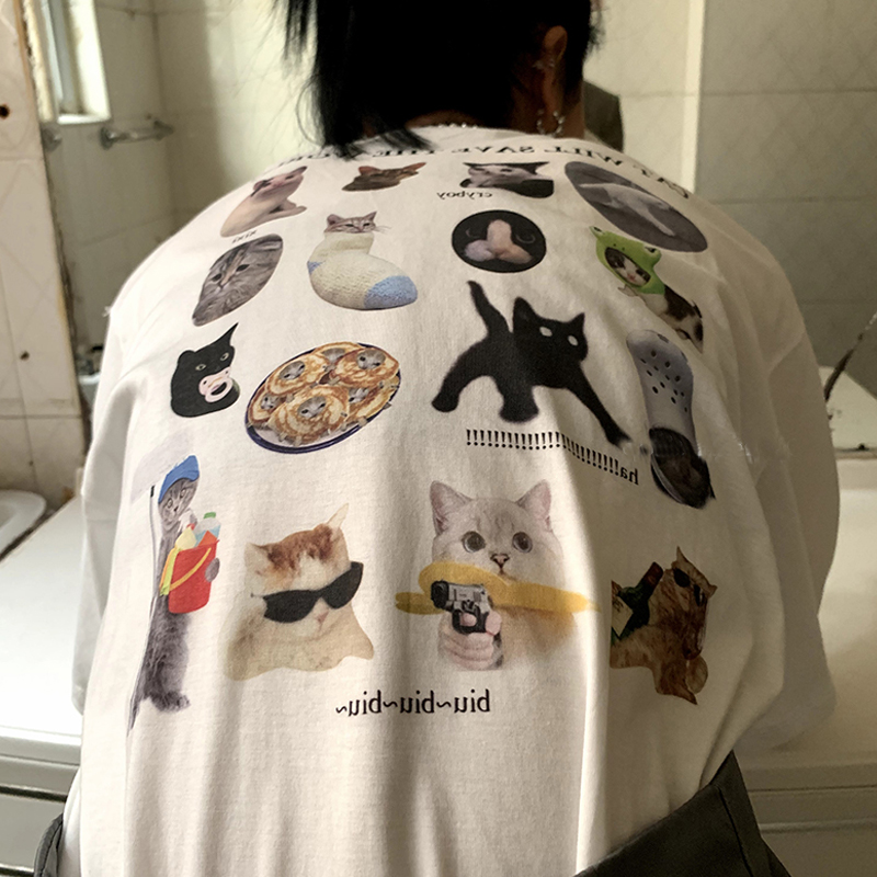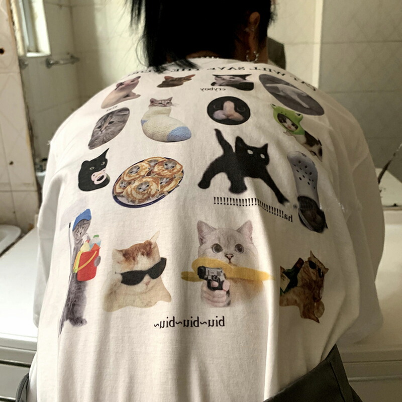 猫バックプリントTシャツ半袖トップスカットソーネコねこキャットロゴ白ホワイト大きいサイズビッグアニマル動物ダンス衣装ヒップホップHIPHOPレディースメンズガールズストリート個性的奇抜カラフル可愛い