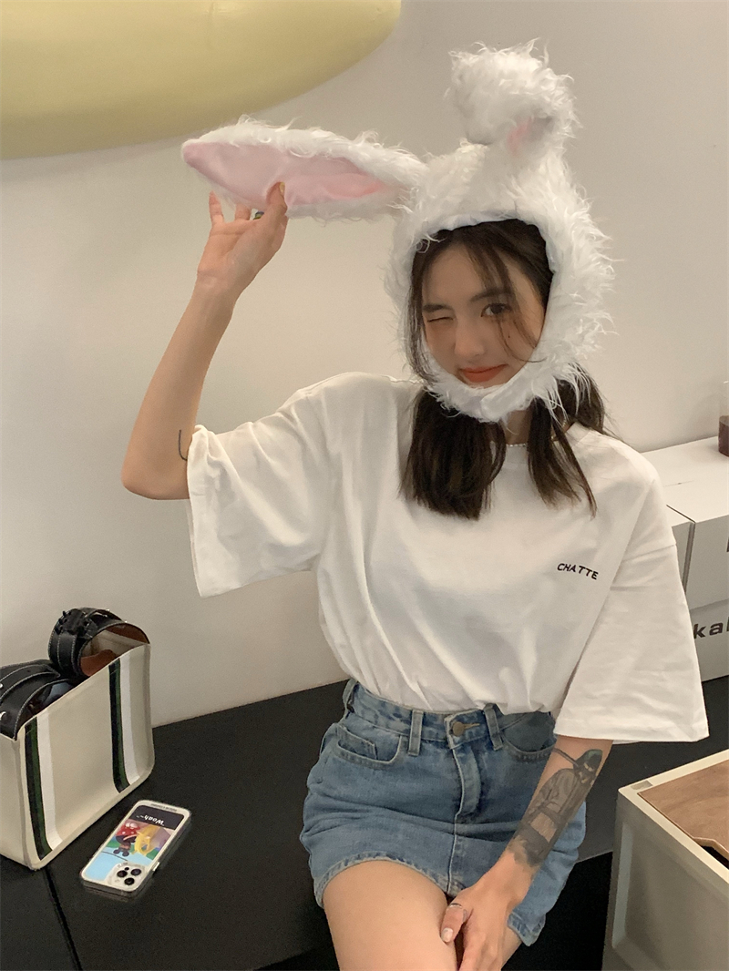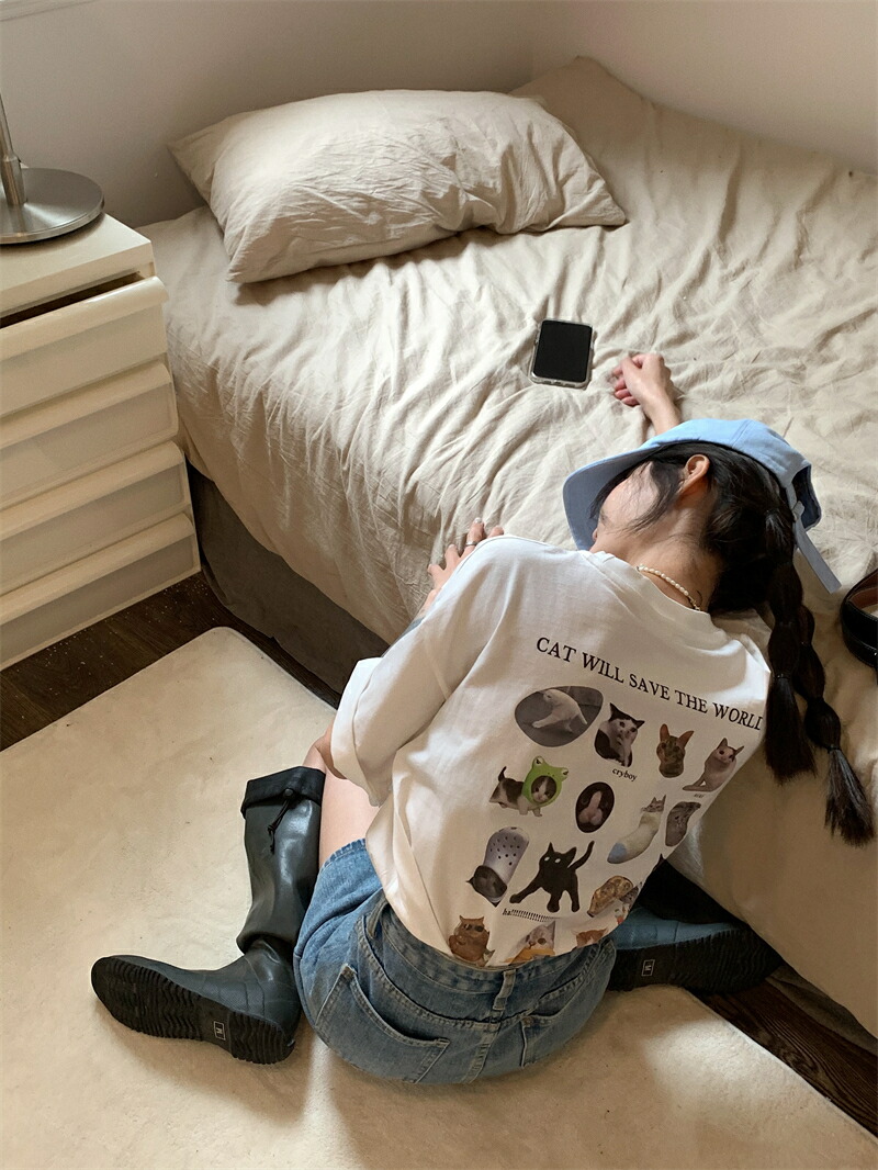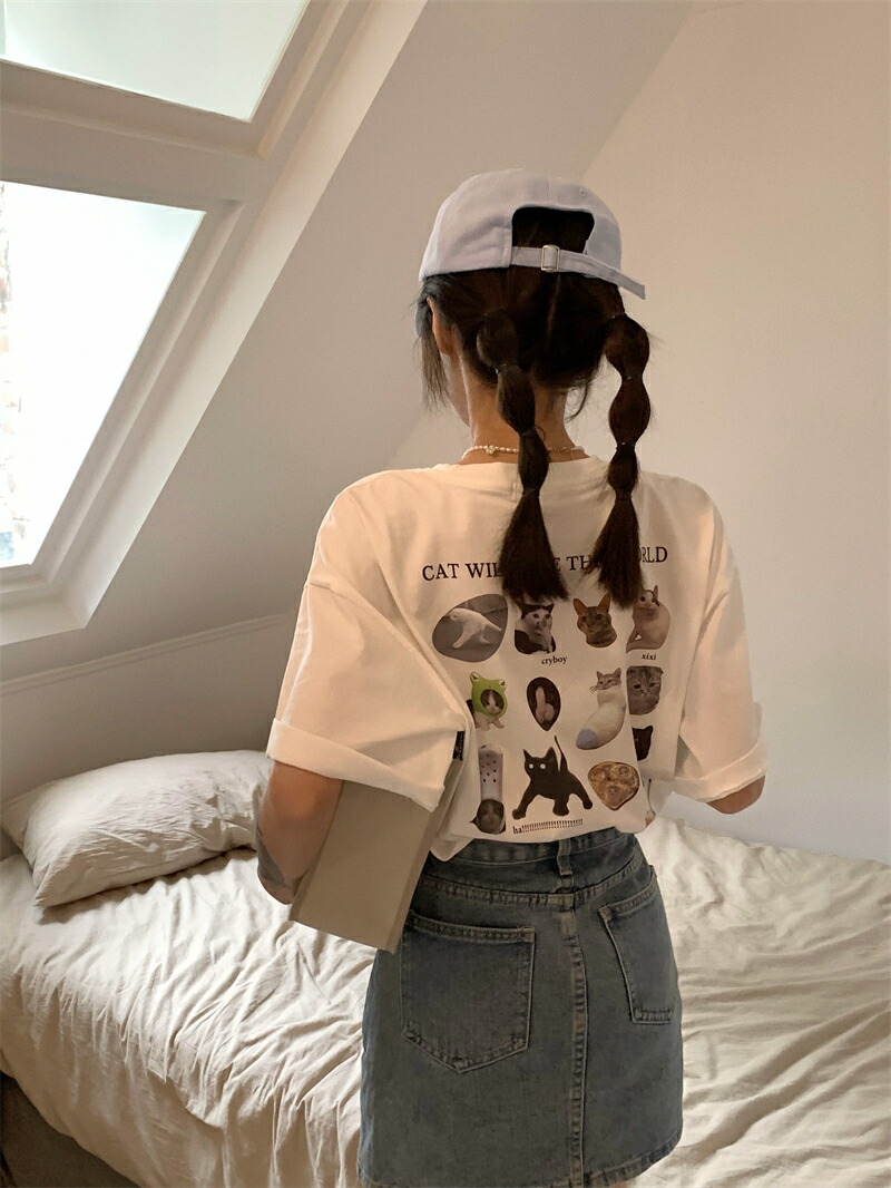 猫バックプリントTシャツ半袖トップスカ