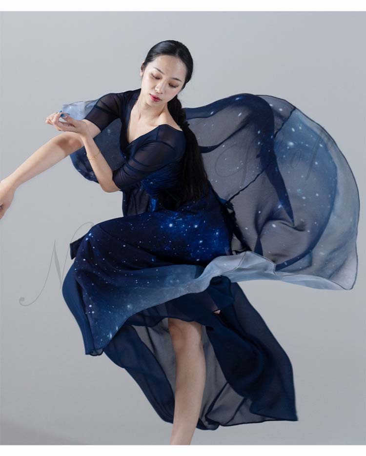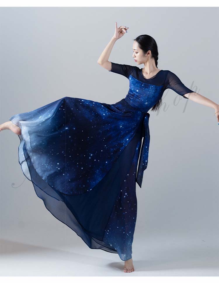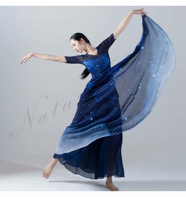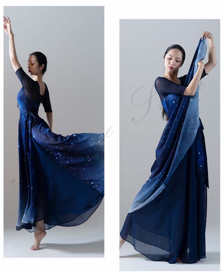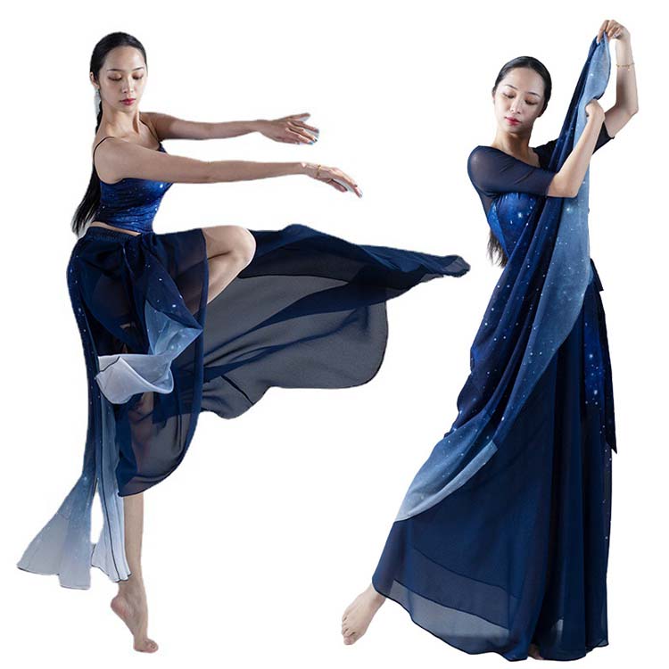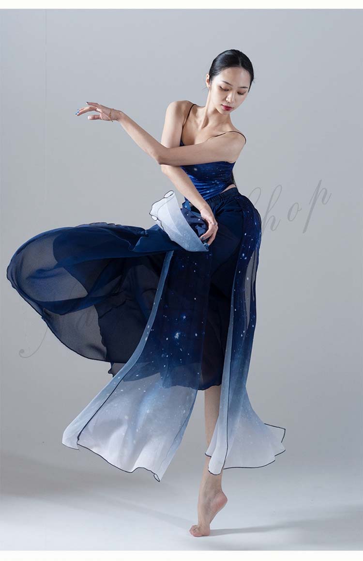 古典舞踊ダンス衣装 スリット レッスン着 L XL シフォン広がるスカート 夜空 大きい裾 モダンダンススカート 踊りやすい M 紺色系 新作 古典ダンス 練習着 リボン 星空 キャミソール