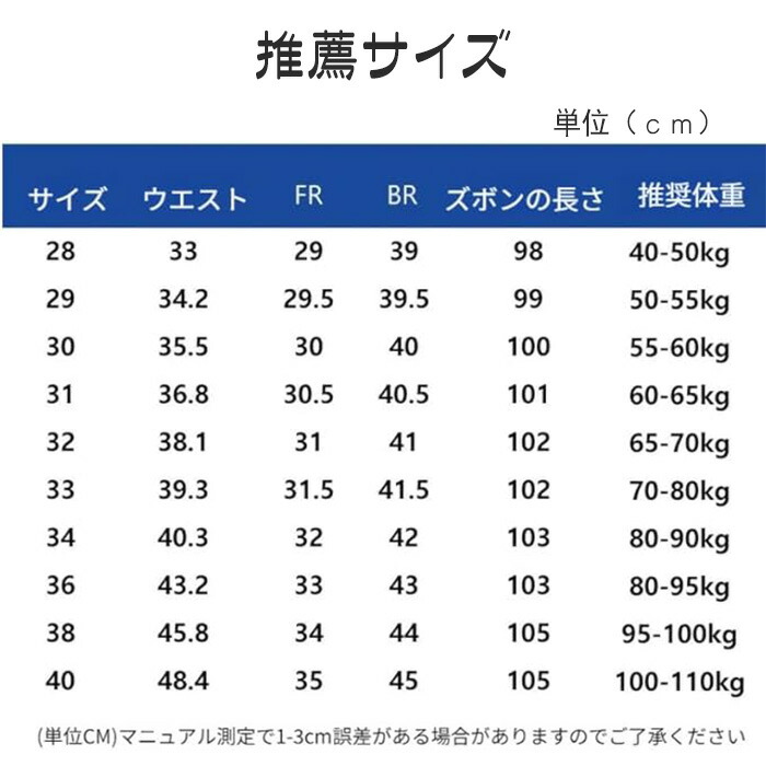 Key1714526599121: 28(40-50kg) 29(50-55kg) 30(55-60kg) 31(60-65kg) 32(65-70kg) 33(70-80kg) 34(80-90kg) 36(80-95kg) 38(95-100kg) 40(100-110kg)