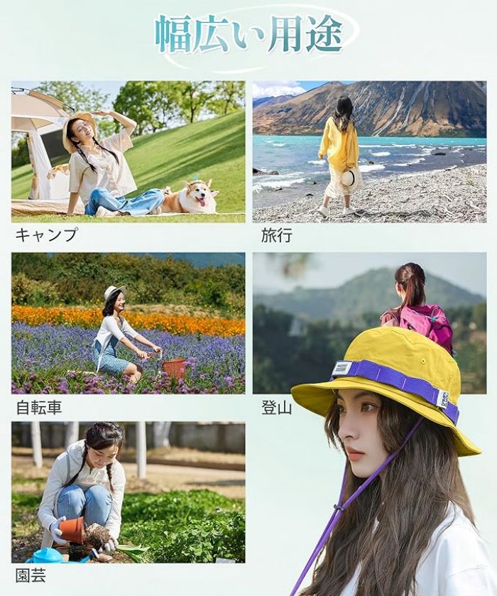 【 通気性・速乾性】:裏地には接触冷感メッシュ素材を使用、通気性と清涼感のある構造、蒸れることなく快適な通気性を実現しました。軽量素材で、肌やさしい、長時間の使用でも疲れにくいです。涼しいレディースハット、洗濯後の乾燥が速い、風通し良く、で長い間でも快適に使えるようになりました、この帽子は蒸れた感じを与えない。風の強い日でも飛ばされる心配のない防風チンストラップ付き!帽子 レディース、ハット レディース、サファリハット レディース。夏場の涼しさを演出します、暑い夏の日に涼しさをもたらしてくれる!