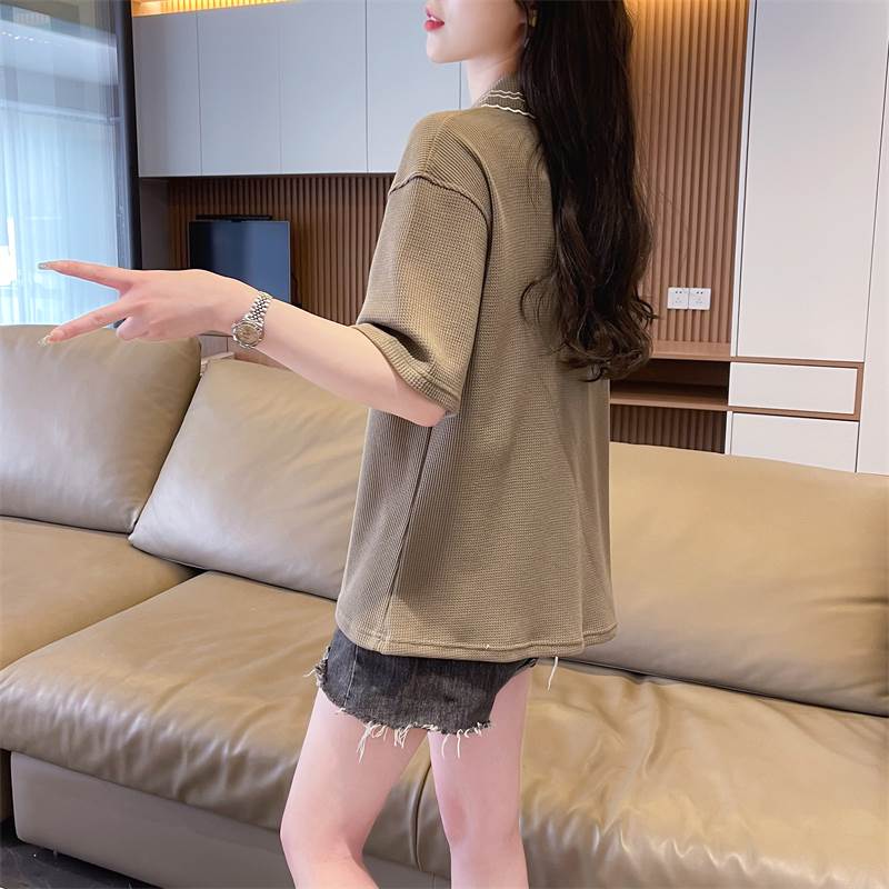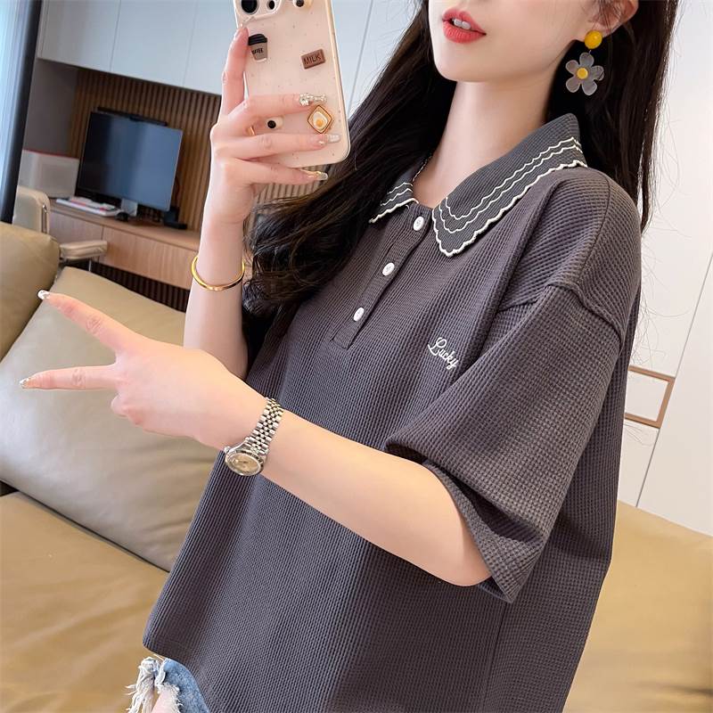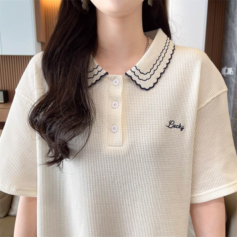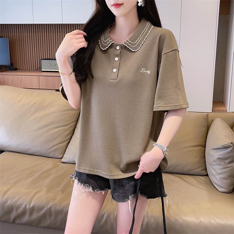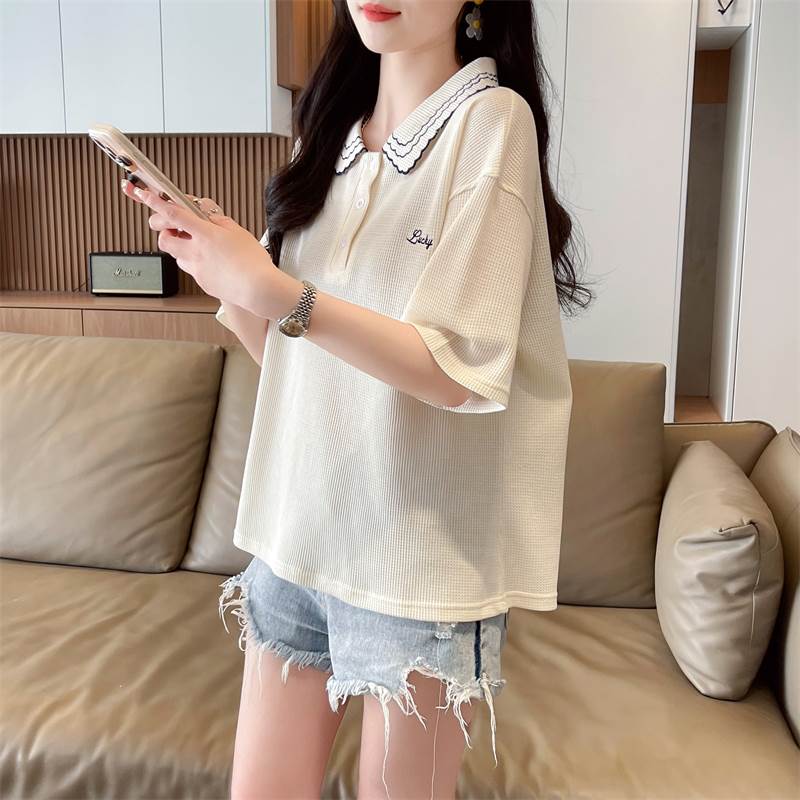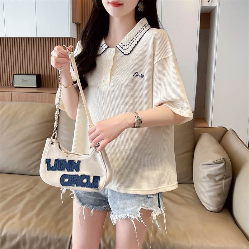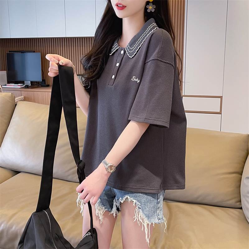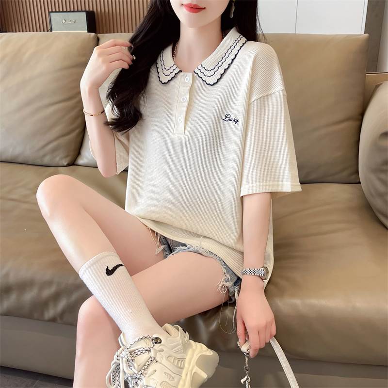 こちらはレディース用のトップス、ポロシャツです。襟には可愛らしい刺繍が施され、ワイドでストレートなシルエットがおしゃれな印象を演出しています。カジュアルにも上品にも使え、シンプルな無地デザインが幅広いコーディネートに対応します。