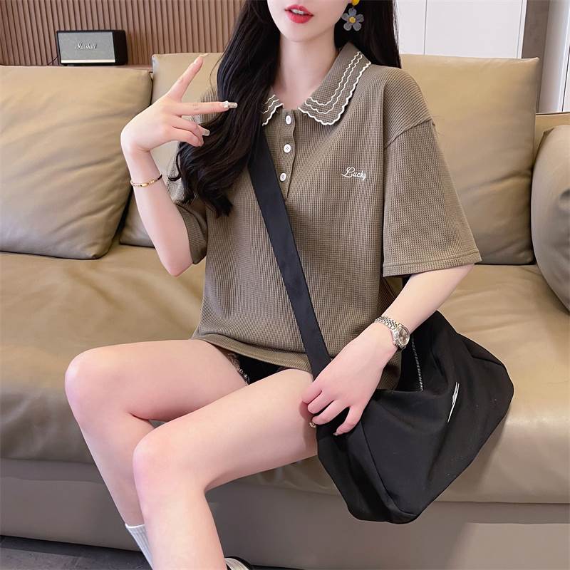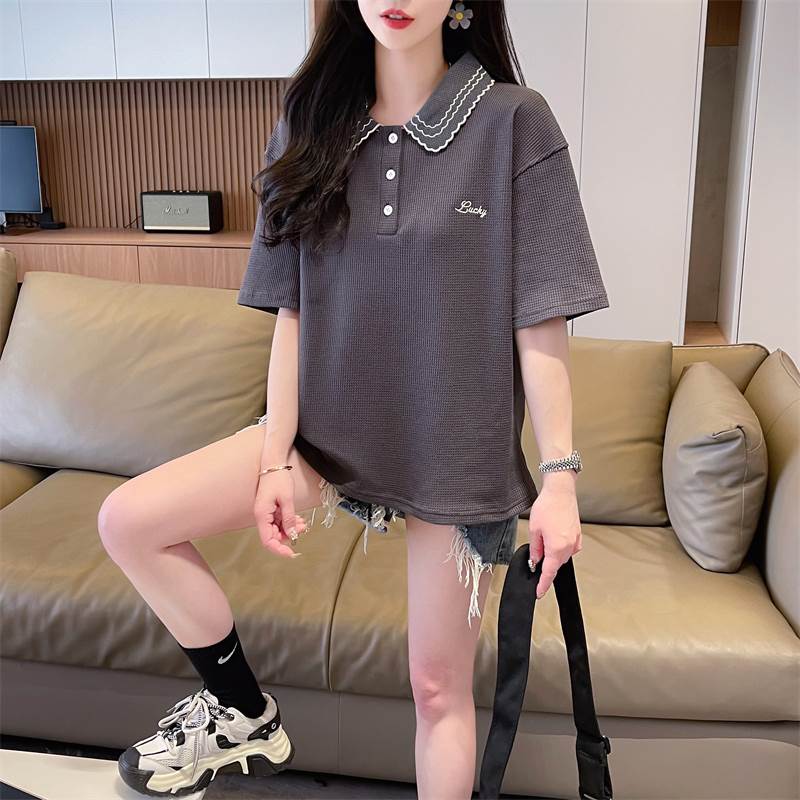 レディース トップス ポロシャツ ミドル丈 半袖 5分袖 襟付き 襟刺繍 ワイド ストレート かわいい 大人可愛い きれいめ シンプル カジュアル おしゃれ ラフ メンズライク ガーリー すっきり 無地 夏 学生 学校 通学 デート お出かけ 休日 コーデ 楽ちん 体型カバー M L XL 2XL ゆったり ゆる ダークグレー カーキ アプリコット