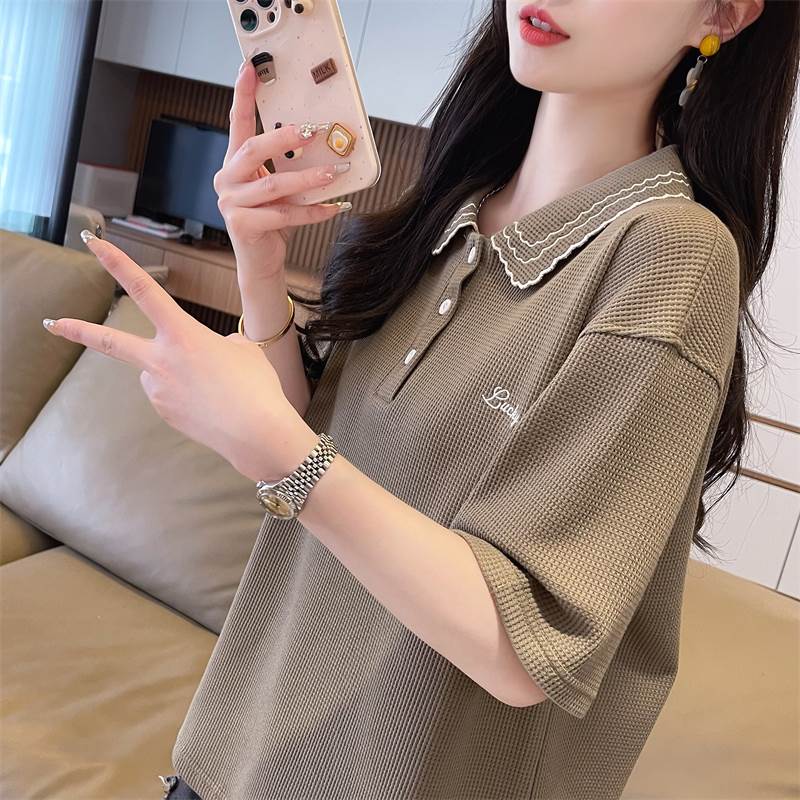 レディース トップス ポロシャツ ミドル丈 半袖 5分袖 襟付き 襟刺繍 ワイド ストレート かわいい 大人可愛い きれいめ シンプル カジュアル おしゃれ ラフ メンズライク ガーリー