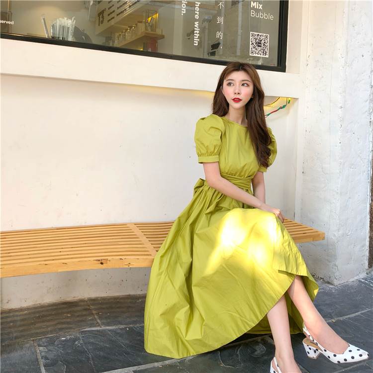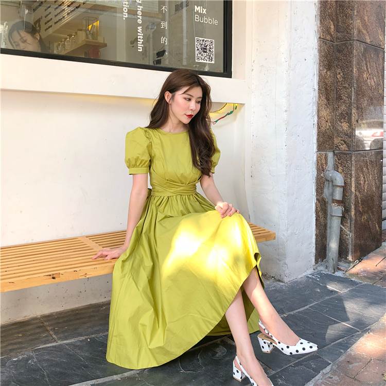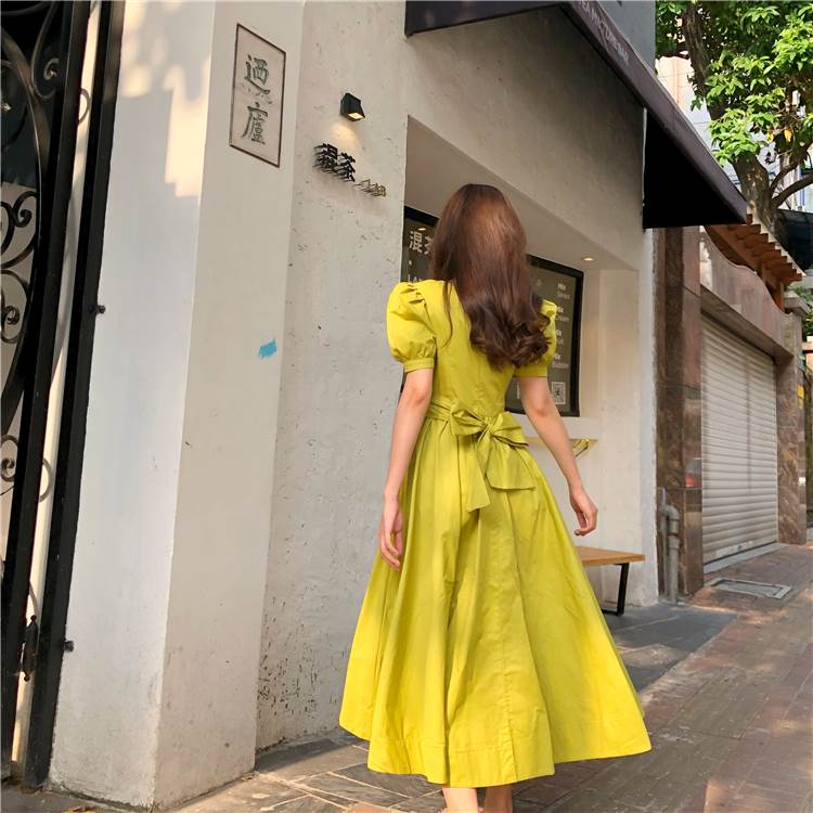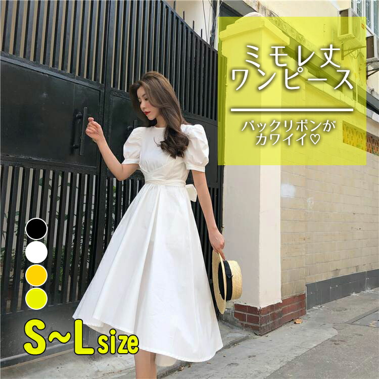 バックリボンフィッシュテールワンピ ワンピース ミモレ 袖あり 半袖 プリーツ フレア かわいい シンプル 上品 キュート フェミニン S M L ホワイト 白 ブラック 黒 イエロー 黄色 グリーン 緑 黄緑 10代 20代 30代 40代 デート お出かけ インスタ映え