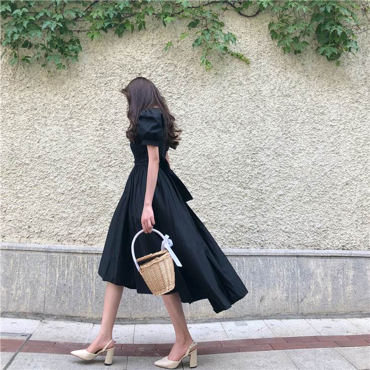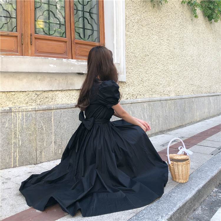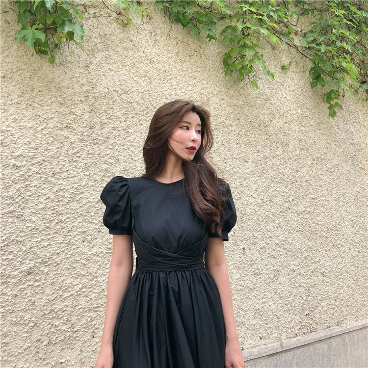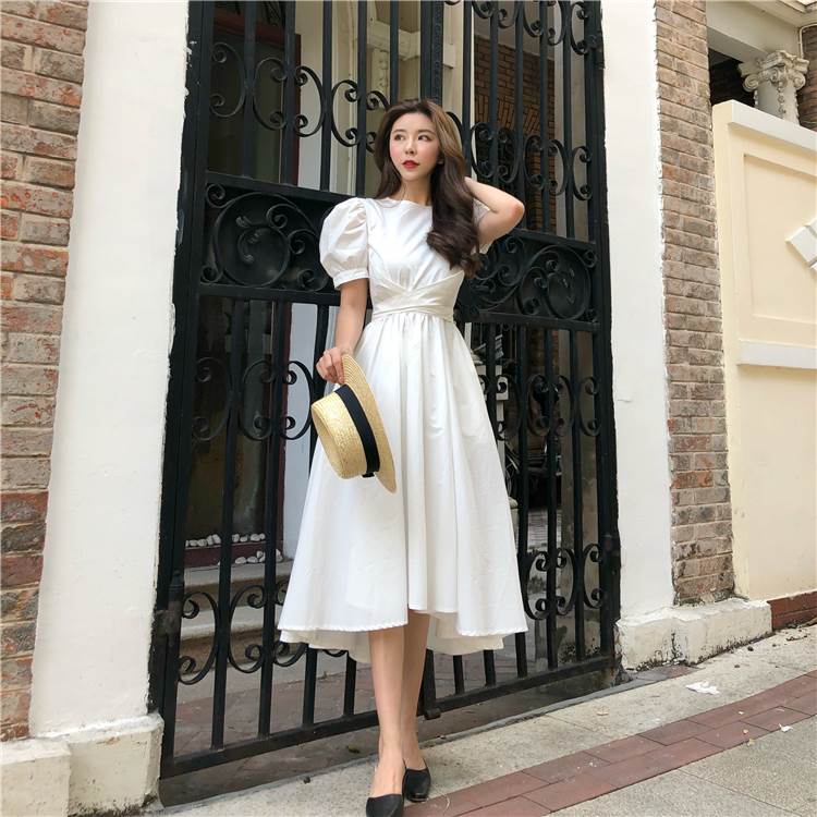 ワンピース レディース バック リボン きれいめ フィッシュテール ミモレ パフスリーブ 袖あり 襟なし 半袖 膝下 プリーツ フレア かわいい シンプル 上品 フェミニン おしゃれ 10代 20代