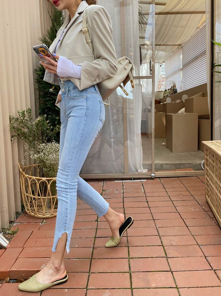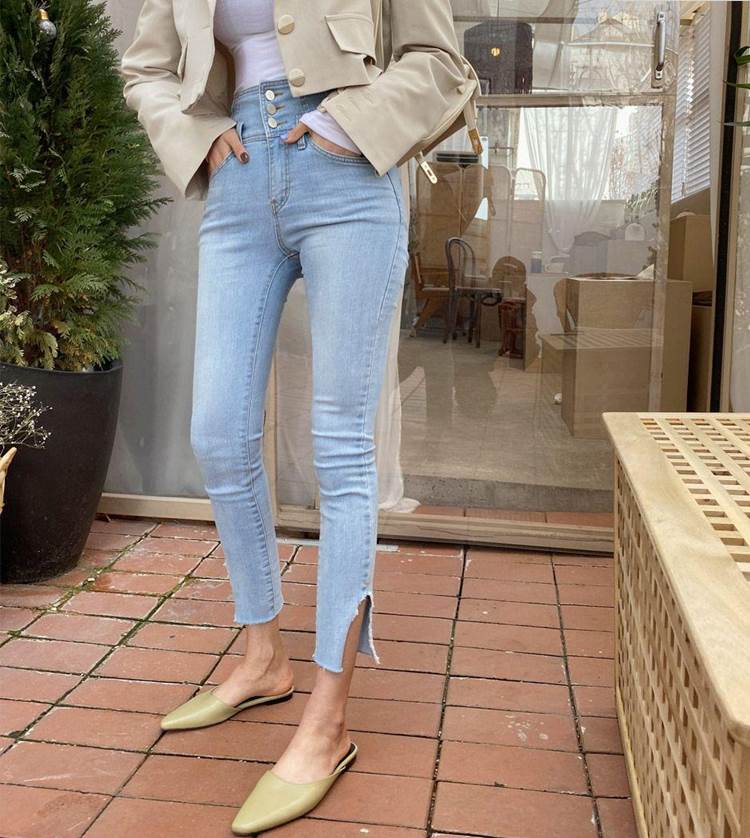 レディース ハイウエスト デニム パンツ スキニー 美脚 脚長 ボトムス スリム タイト 細身 ポケット ライトブルー ボタン かわいい 大人可愛い きれいめ シンプル カジュアル おしゃれ