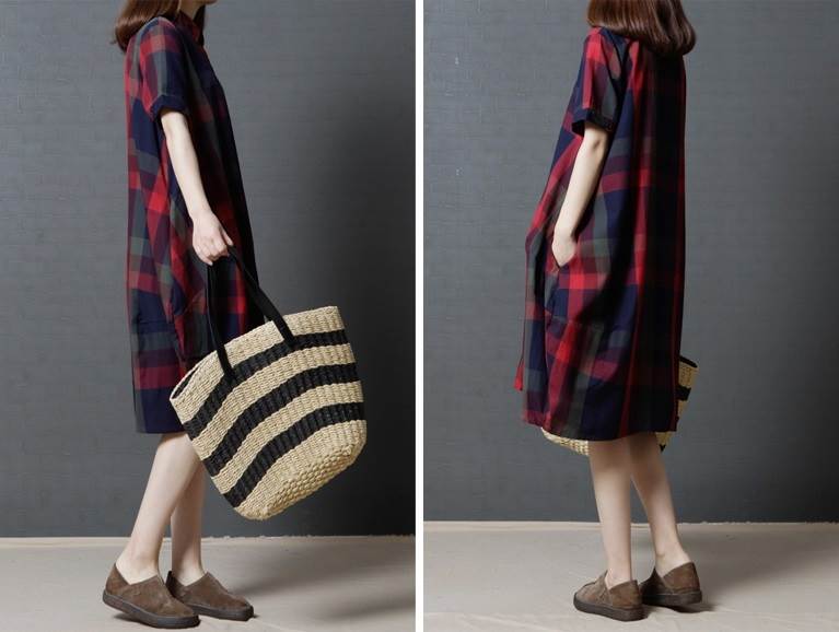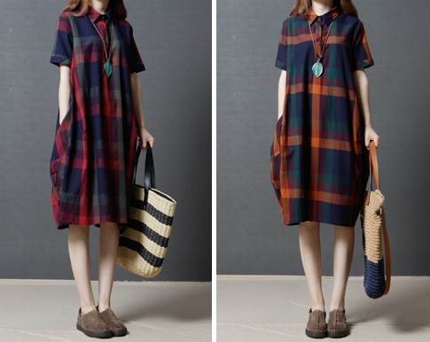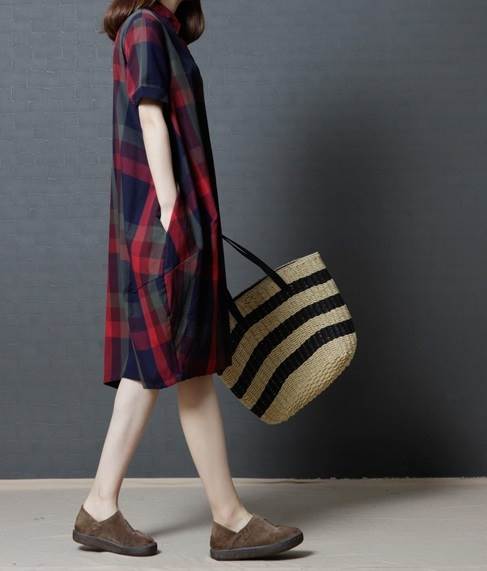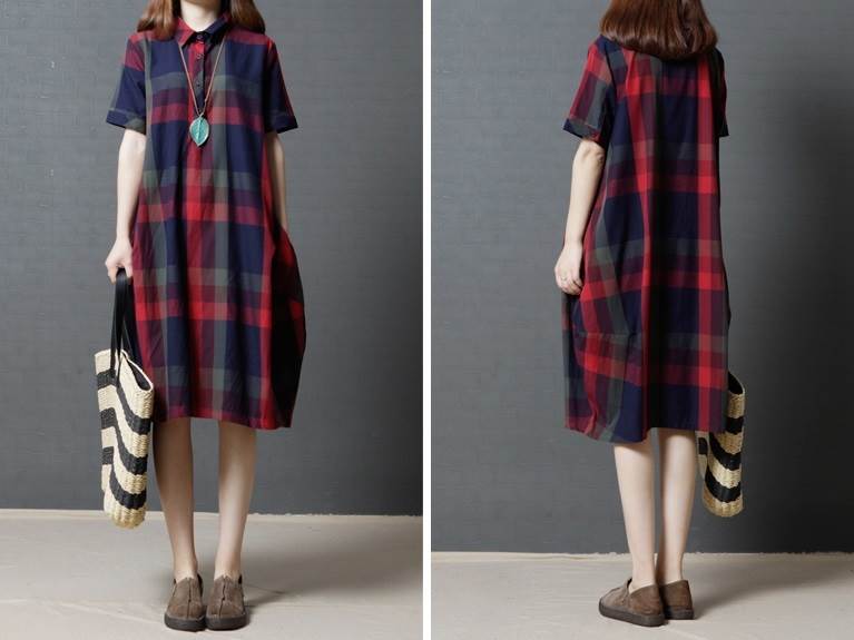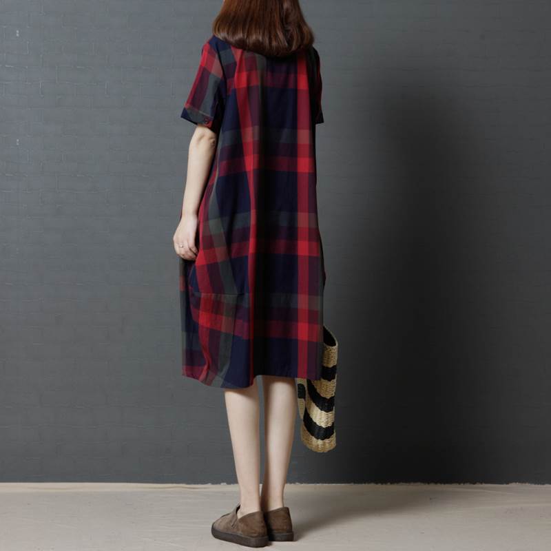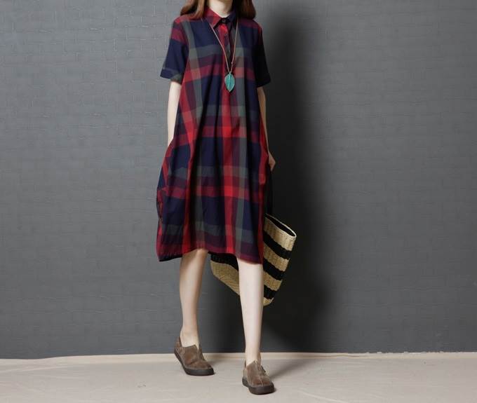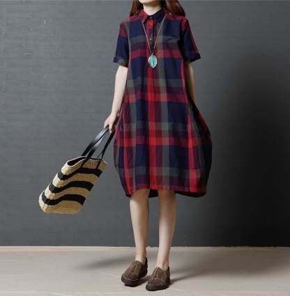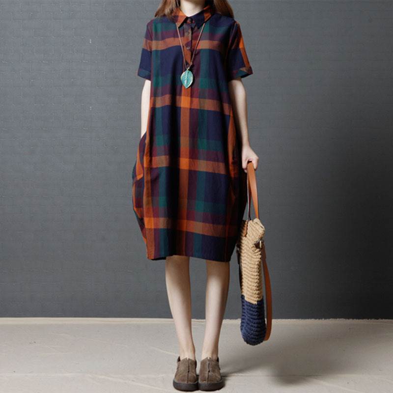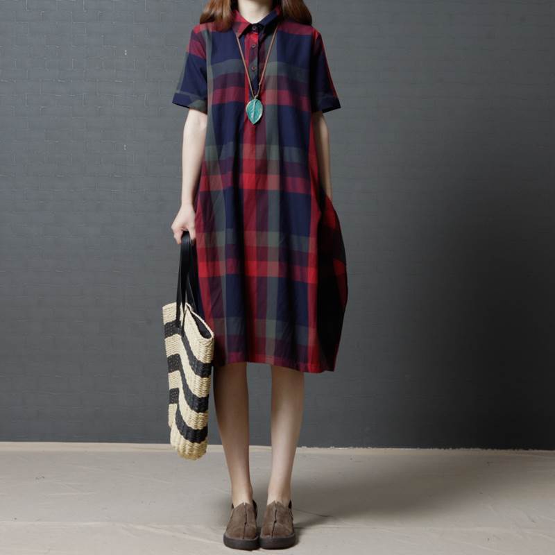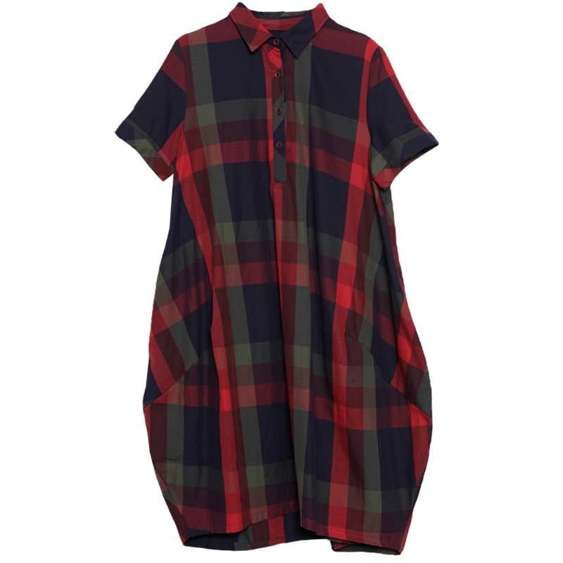 ワンピース レディース レトロ チェック柄 綿 コットン 半袖 ゆったり ルーズ ゆる ポケット付き 体型カバー ひざ下 ミディ丈 襟付き ポロ襟 フロントボタン 薄い 清楚 おしゃれ 通勤