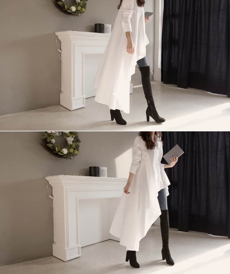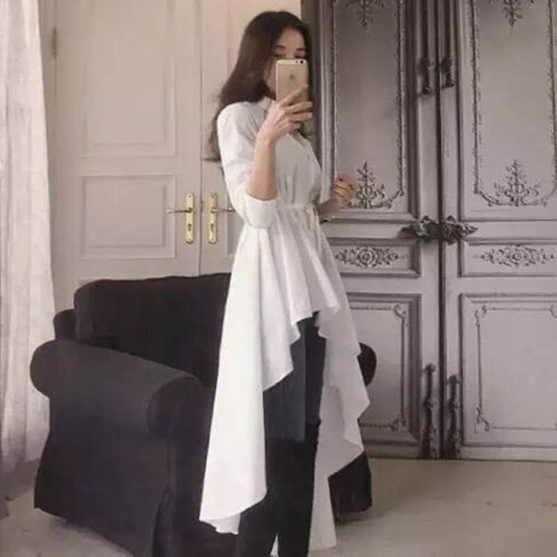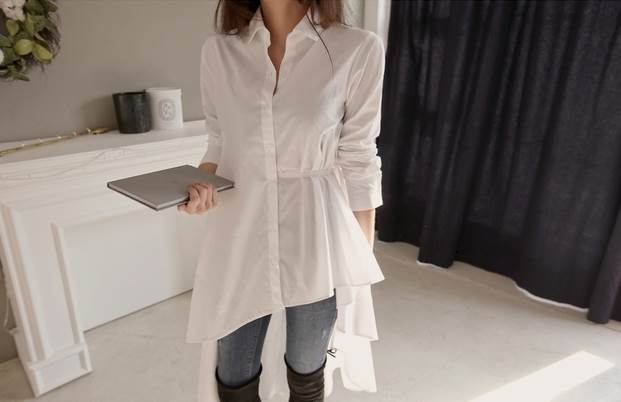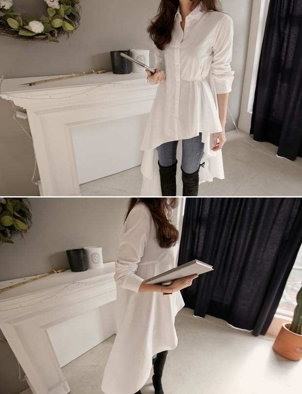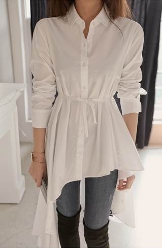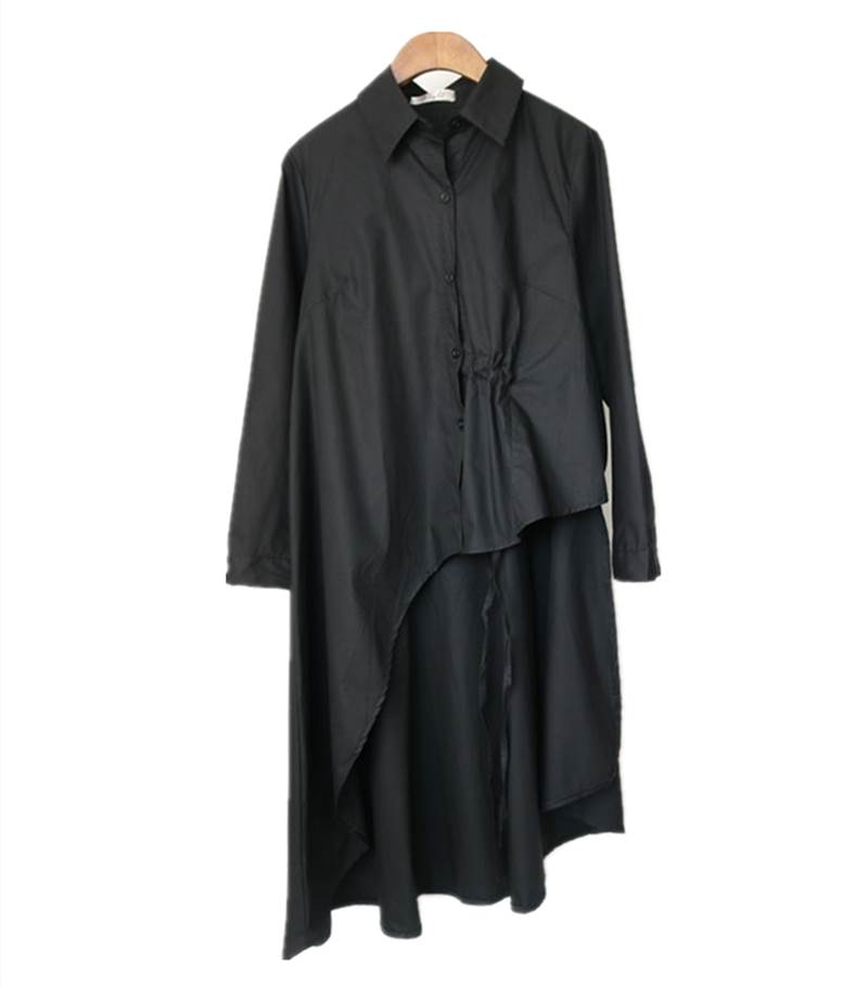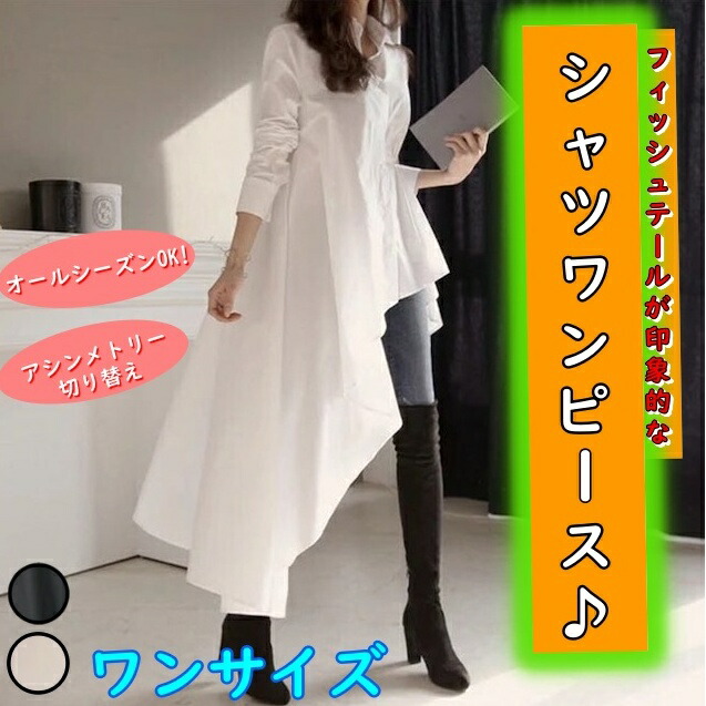 シャツ ワンピース レディース チュニック ブラウス アシンメトリー ホワイト ブラック 長袖 襟付き ボタン フィッシュテール 切り替えデザイン ウエストマーク ギャザー スタイルアップ