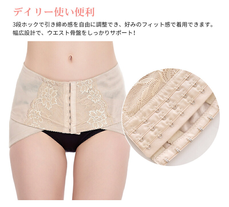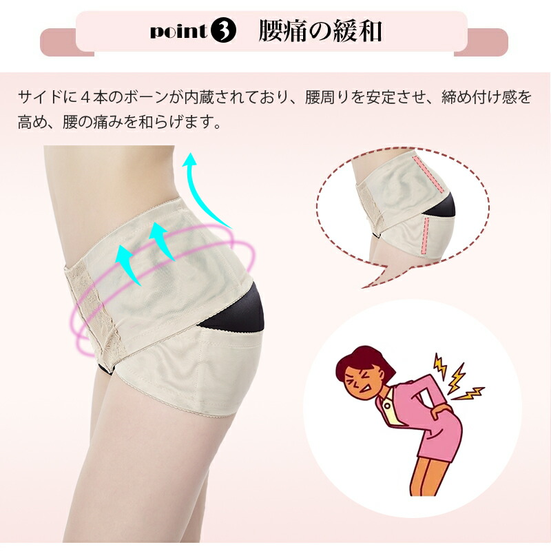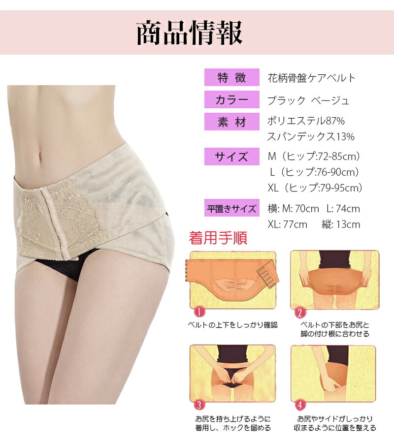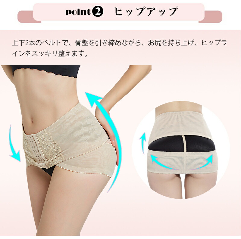 上下左右から骨盤を安定させ、しっかりサポー トしてくれる、Wベルト仕様です。 お洒落な仕立てで、ランジェリーのよう なソフトな肌触り。 一日中着けていても痛くならず、極薄だ からアウターにも響きません。 家事やお出かけ中でも締め付け感がなく立ち座 りしてもずれにくい、ストレスフリーな女性専 用のソフト骨盤ベルトです。
