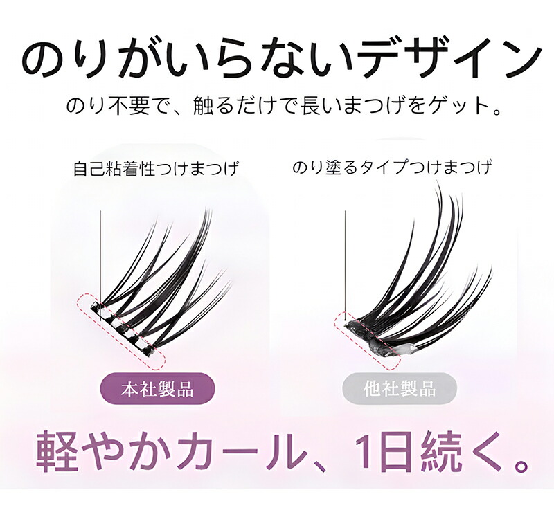 【接着剤不要のつけまつ毛】各つけまつ毛の根元には粘着剤のテープが付いており、接着剤を塗る必要はありません。自毛の根元に直接貼り付けるだけでOKです。