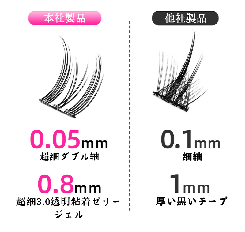 【太い軸での貼りやすさ向上】アップグレードされたセクション付きのまつ毛の軸は通常のものよりも太く、貼り付けがより安定します。