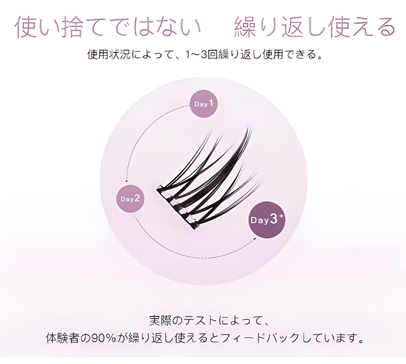 【繰り返し使用可能】付けまつ毛に付いている粘着テープの粘着力が低下した場合、ピンセットを使ってテープを外し、通常のまつ毛として継続して使用できます。