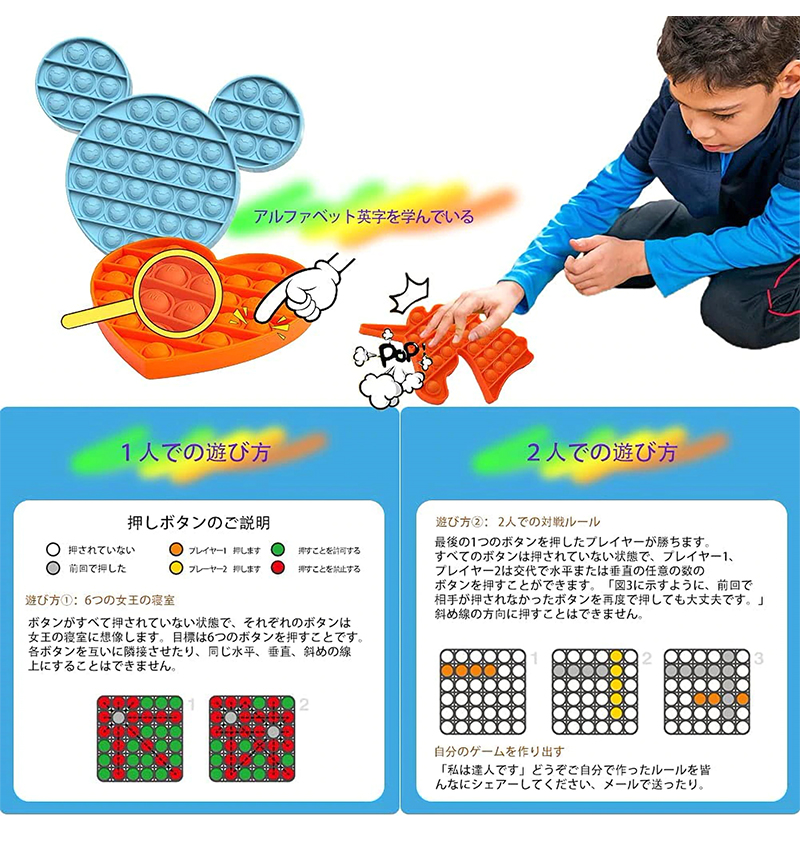 2.一人、二人、多人数など、高齢者、子供、大人、親子ゲームといろいろな遊び方ができます。自分に挑戦して、相手と素早く競い合うことができます。ルールはとても簡単、習いやすい、素早く上手にできます。バブルを押し下げるだけで、少し弾けるような音がします。次に、それを裏返して、もう一度やり直してください!押すことを楽しみながら快適なタッチ感を与えて、何回も繰り返してからもやもやストレスを吹き飛ばせて、感情を取り戻し、落ち着かせることができます。遊びの同時に子どもたちの論理能力、集中力、社交能力、推理能力を鍛えて、インテリジェンス発展にも役に立ちます。家族や友達、子供たちが一緒にクリエーションの時間を楽しくの最適な知育おもちゃです。
