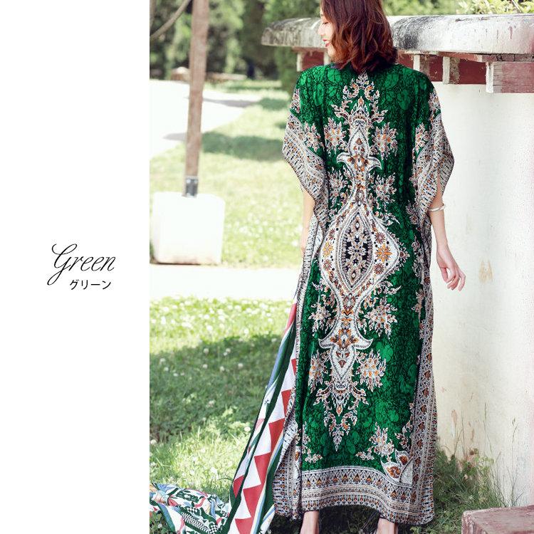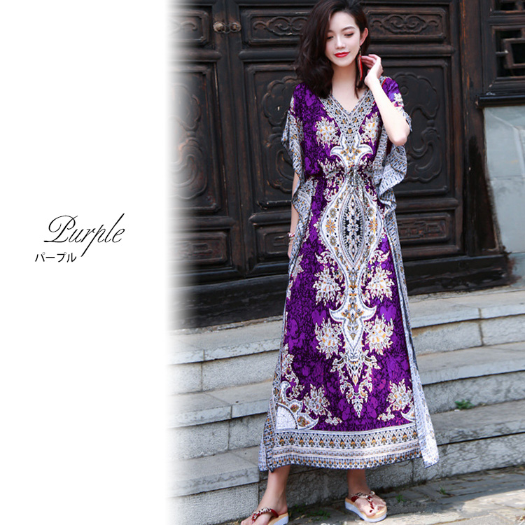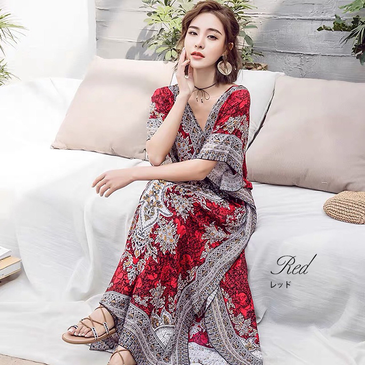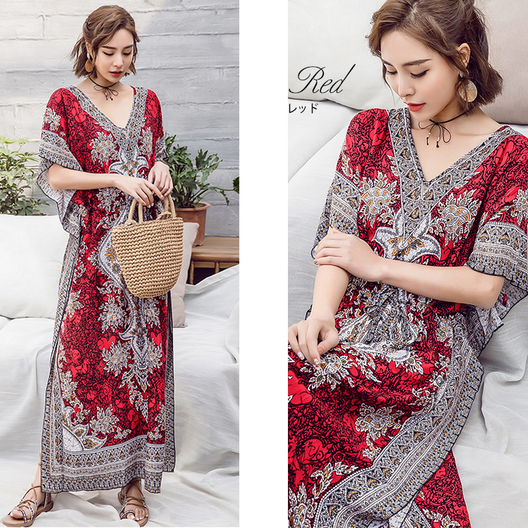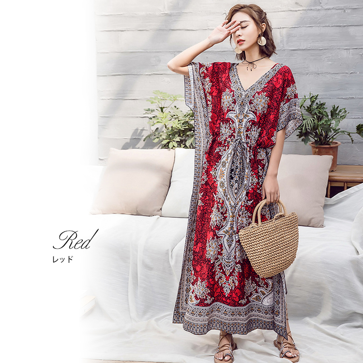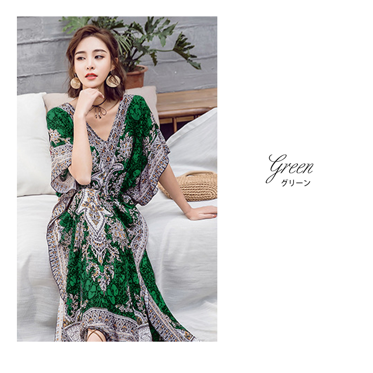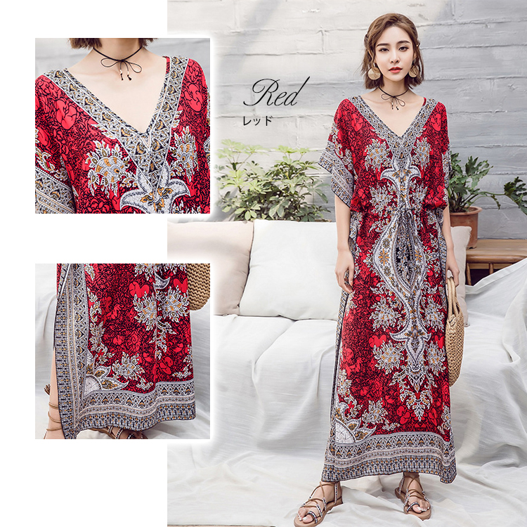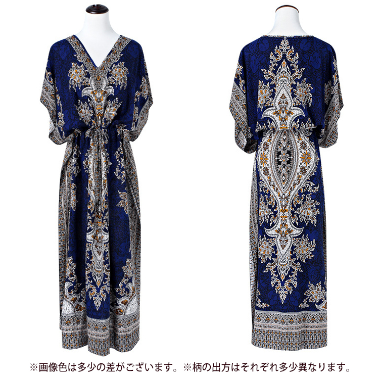 フリーサイズ Vネック ボタニカル柄マキシ ペイズリー柄マキシ ウエスト紐付 ロング丈マキシ ボタニカル柄 ロング丈マキシワンピース カラフル レディース リゾート