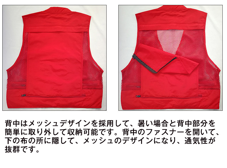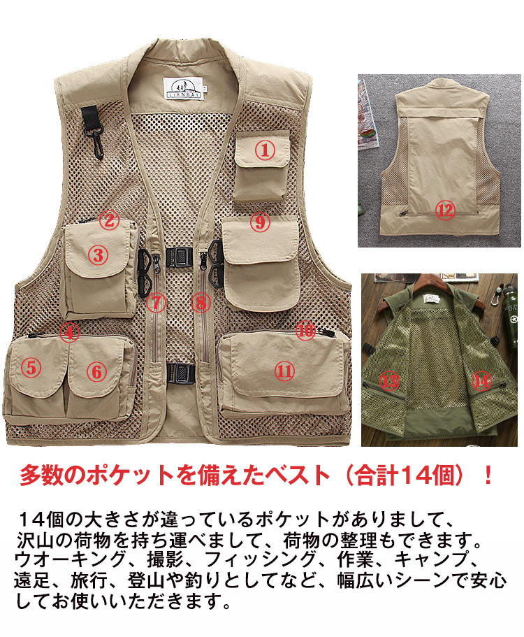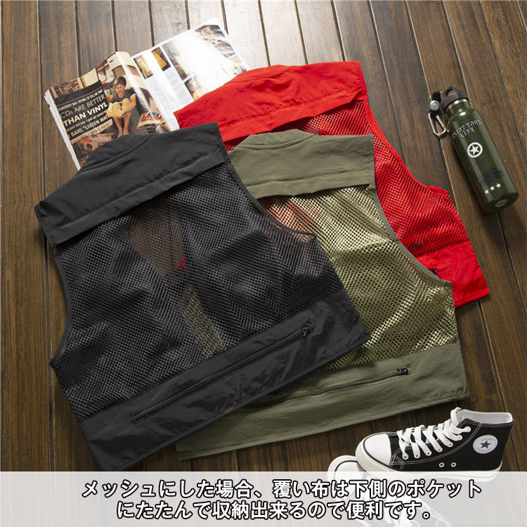 ※お客様のご覧になられますパソコン機器及びモニタなどの違い、また室内、室外での撮影により実際の商品素材の色と相違する場合もありますのでご了承下さい。商品情報商品名 ベスト メンズ メッシュベスト アウトドアウェア素材 ポリエステル50% ポリウレタン 50%カラー ベージュ ネイビー レッド 黒 オリーブ生産国 中国包装について 環境保護の観点から、「簡易包装」を推進しております明細書について 当店ではエコロジーと個人情報流出防止のため、ご指示の無い限り明細書を発行しておりません。