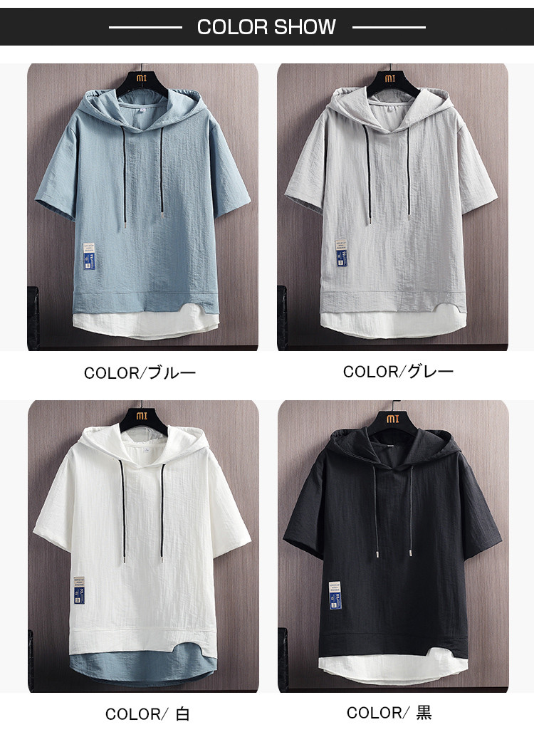 ※お客様のご覧になられますパソコン機器及びモニタなどの違い、また室内、室外での撮影により実際の商品素材の色と相違する場合もありますのでご了承下さい。商品情報商品名 半袖パーカー素材 ビスコースレーヨン52% ポリエステル33% ナイロン15%カラー 黒 白 グレー ブルーサイズ 各サイズの寸法については画像のサイズ表にご参照ください。生産国 中国包装について 環境保護の観点から、「簡易包装」を推進しております明細書について 当店ではエコロジーと個人情報流出防止のため、ご指示の無い限り明細書を発行しておりません。