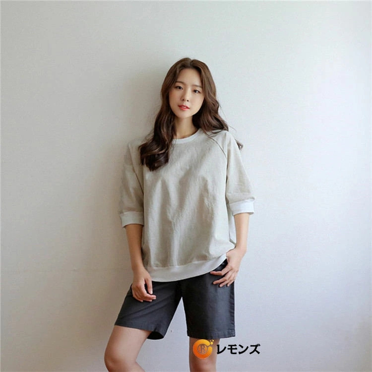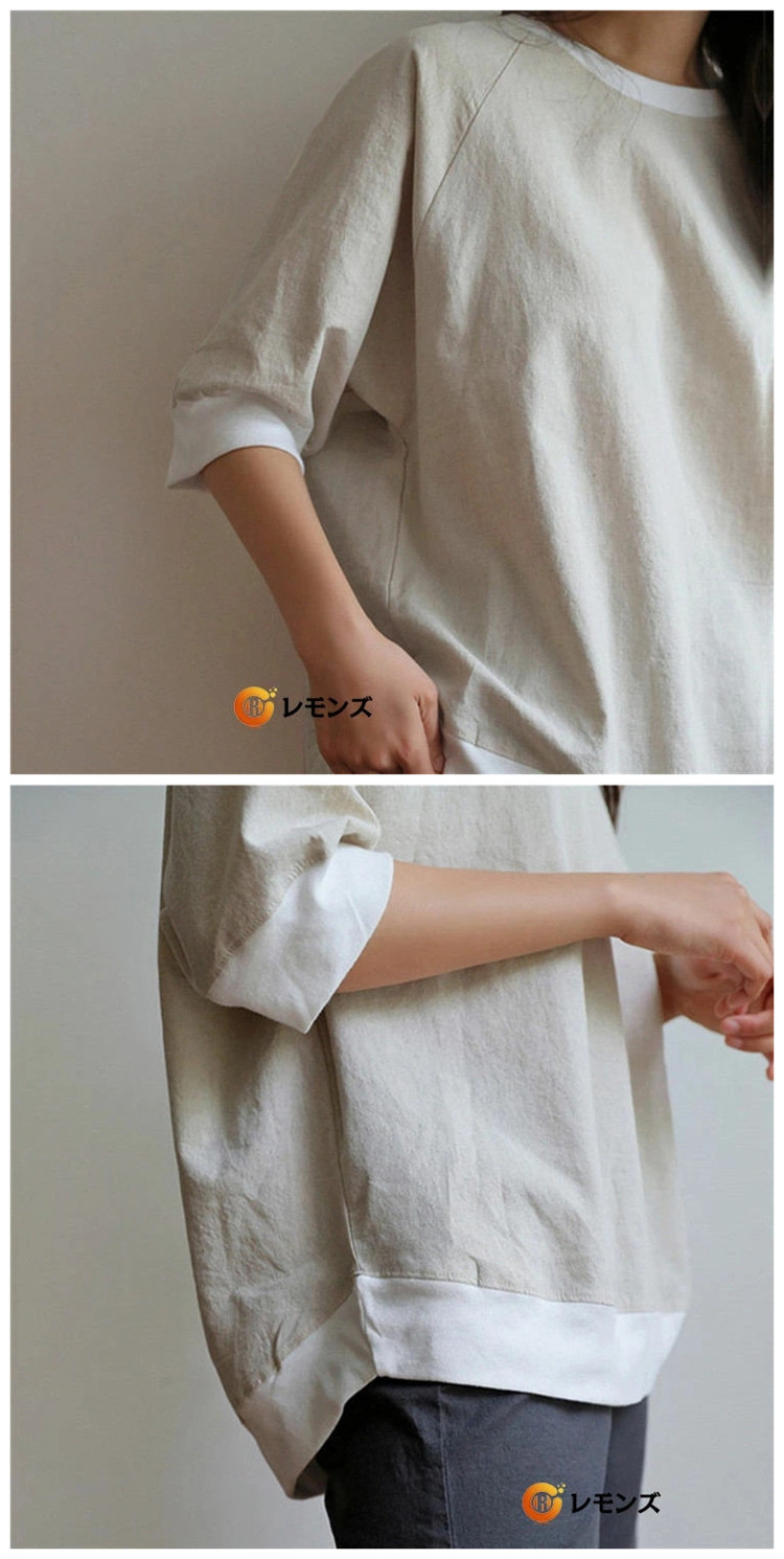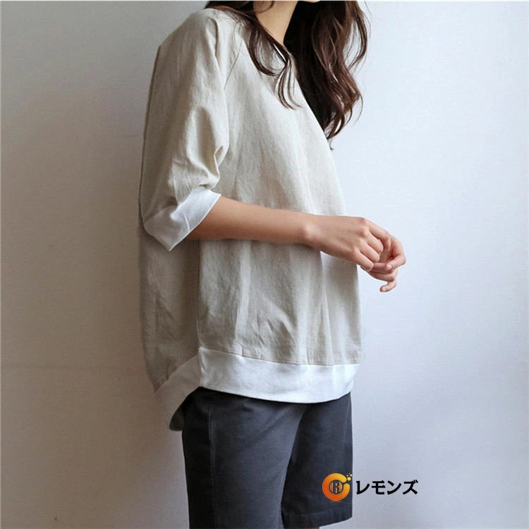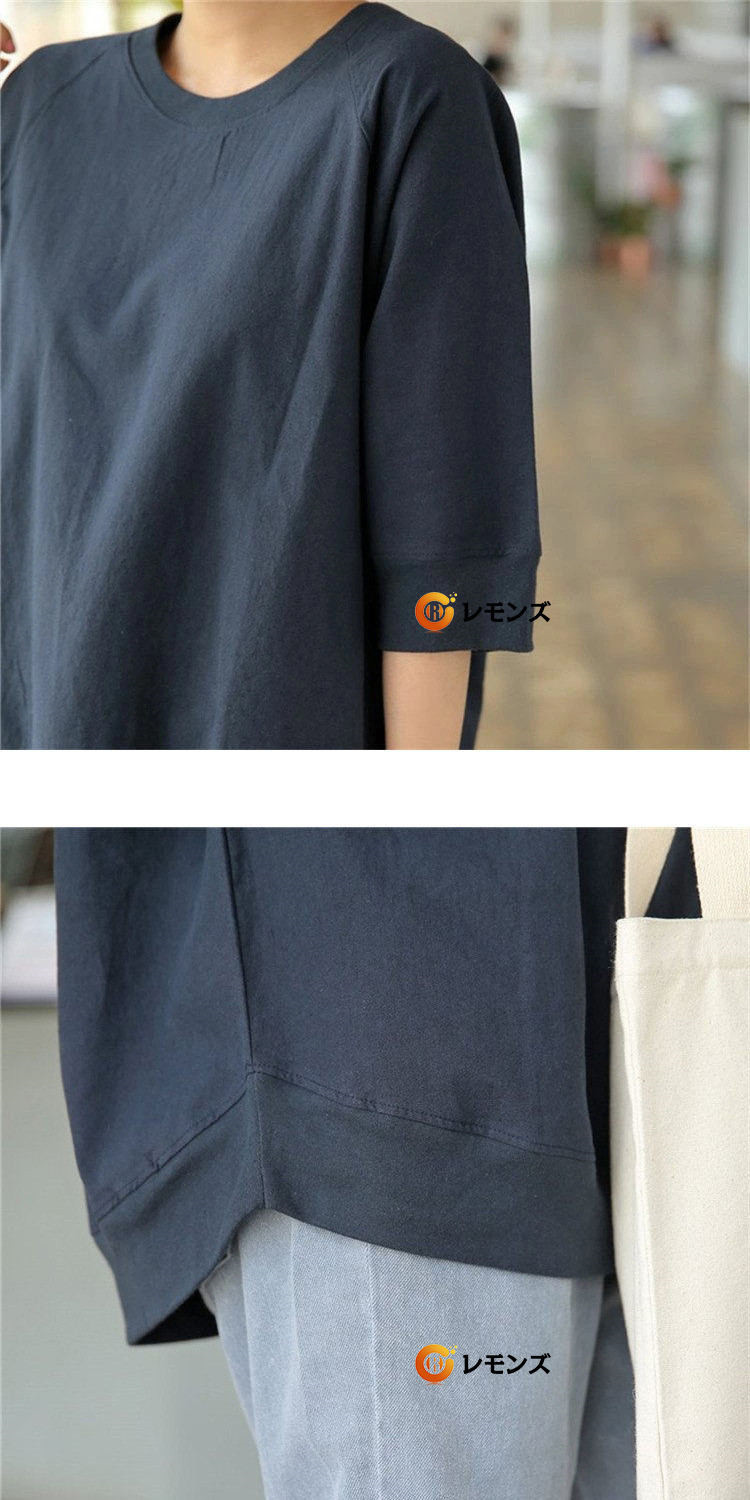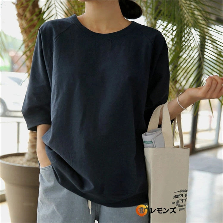 七分袖カットソー レディース 綿麻 リネンTシャツ 7分袖 体型カバー 母の日 プレゼント 部屋着 夏 仕事 ネイビー