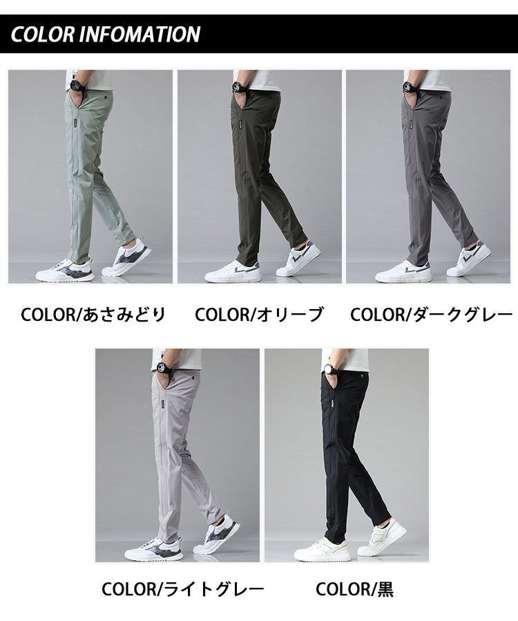 ※お客様のご覧になられますパソコン機器及びモニタなどの違い、また室内、室外での撮影により実際の商品素材の色と相違する場合もありますのでご了承下さい。商品情報商品名 夏ズボン チノパン メンズ ゴルフパンツ 涼しい ストレッチ ロングパンツ 無地 接触冷感 ゴルフウエア 薄手 夏物 カジュアル素材 ナイロンカラー あさみどり ダークグレー 黒 オリーブ ライトグレーサイズ 各サイズの寸法については画像のサイズ表にご参照ください。生産国 中国包装について 環境保護の観点から、「簡易包装」を推進しております明細書について 当店ではエコロジーと個人情報流出防止のため、ご指示の無い限り明細書を発行しておりません。