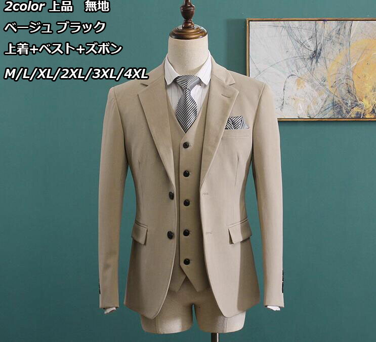 メンズファッション 2色 メンズスーツ 無地 3点セット ジャケット+ベスト+ズボン 3ピーススーツ ビジネススーツ 落ち着いたスーツ 大きいサイズ M~4XL 2つボタン カジュアルスーツ
