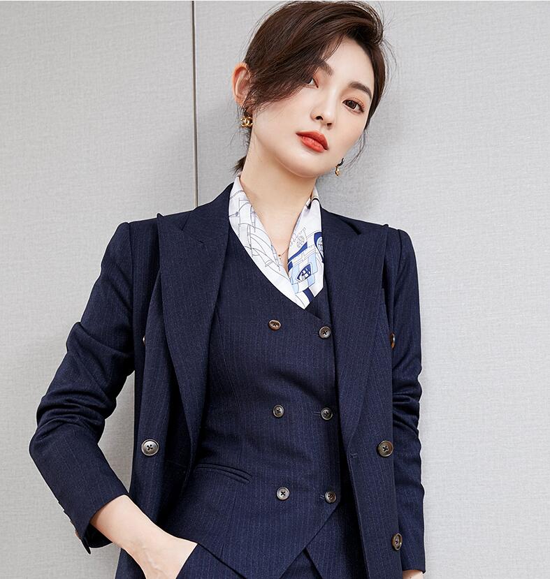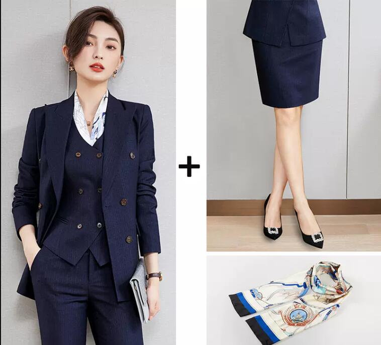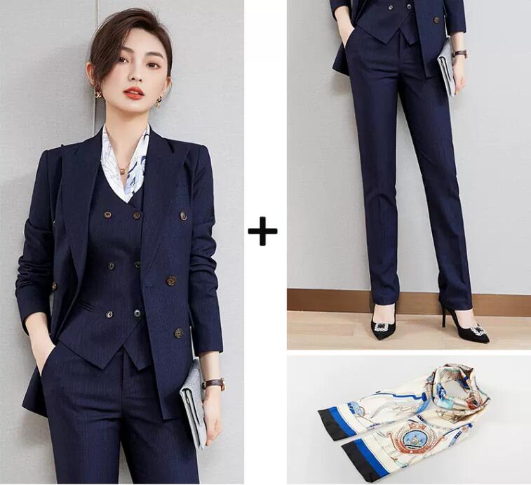 上品 ストライプ 縞々柄 5点セット レディース ジャケット+ベスト+パンツ スカート スカーフ レディーススーツ 3ピーススーツ S~3XL スリムスーツ ネイビー スカーフ付き