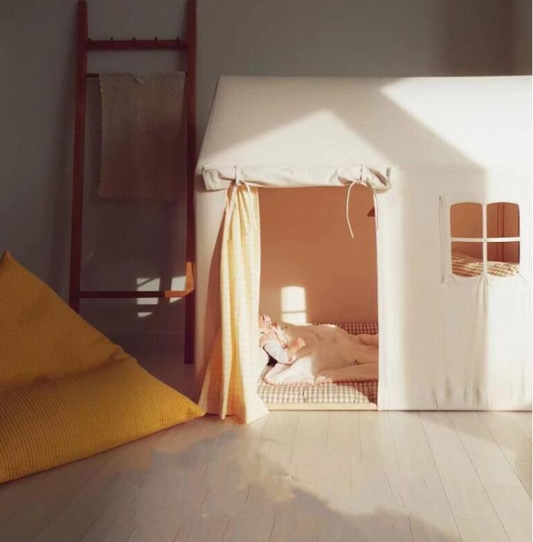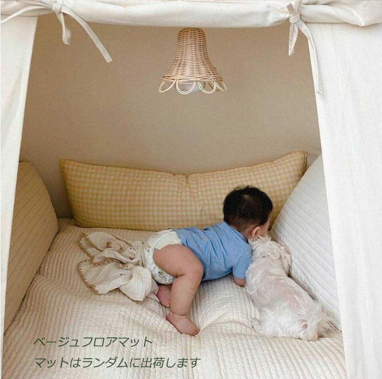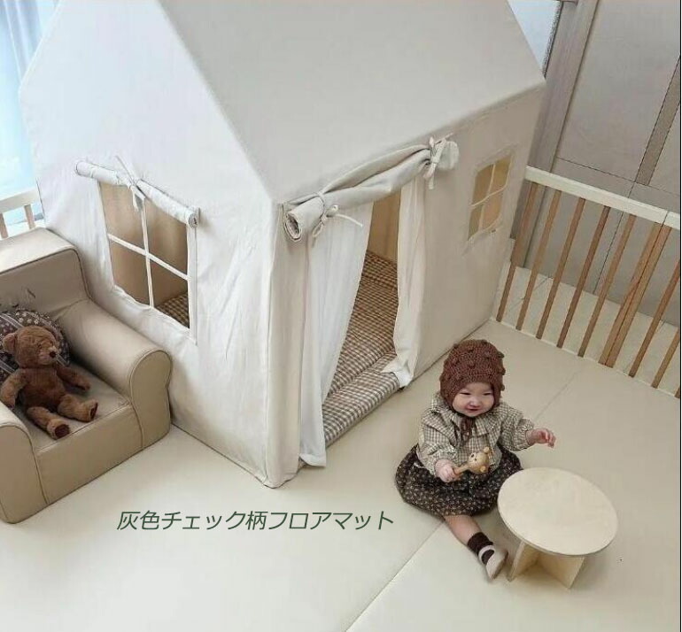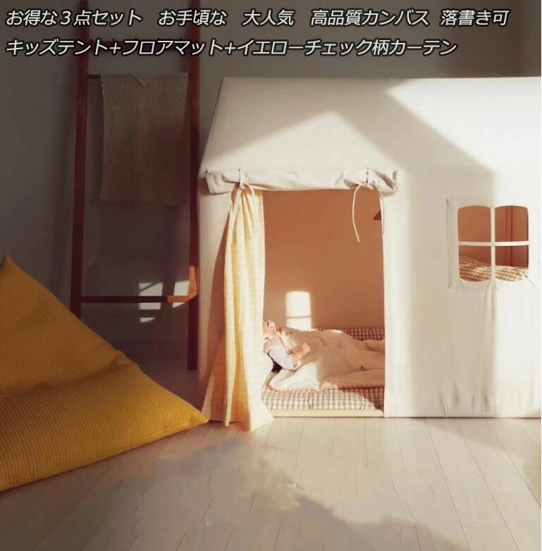 ベージュ 3点セット キッズテント 子供部屋 プレゼント 子供テント キッズ プレイテント カンバス 洗える 丸洗い 小屋+厚手フロアマット+ノレン黄色チェック柄 PVCブラケット 男女兼用