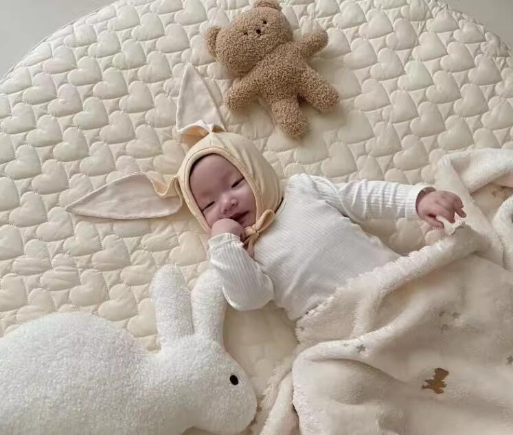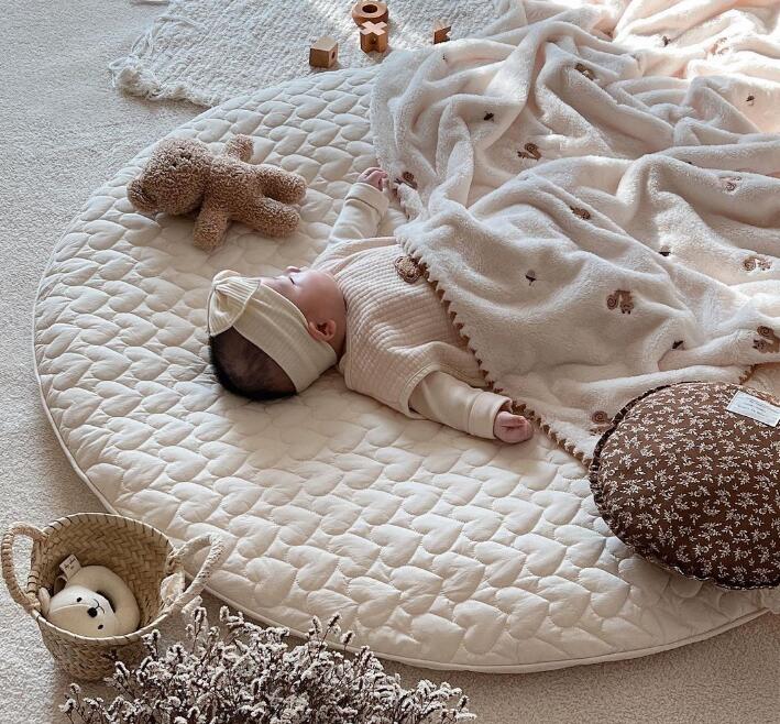上質なイブル素材を使用した洗える丸型クッションマット<ラウンドラグマット> ベビーのプレイマットとしてやペットマットとして、インテリアとしても人気です。高密度でしっかりと織られた肌ざわりのよいコットン100%の生地、表面は100番手の糸で織られた生地を使用しております。糸は細くきめ細かやで、肌触り抜群の生地になり、その分高級とされています。