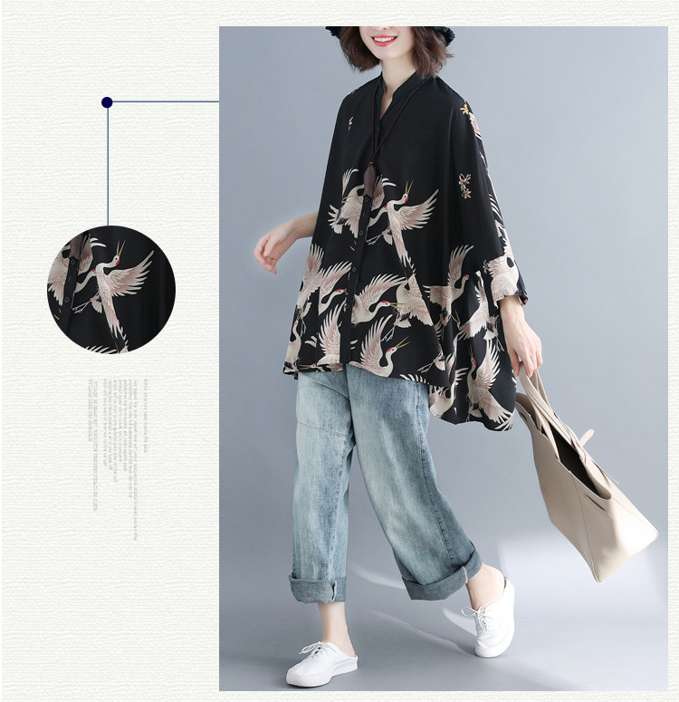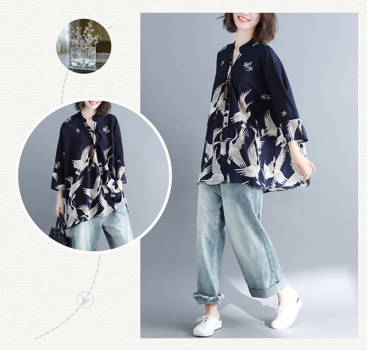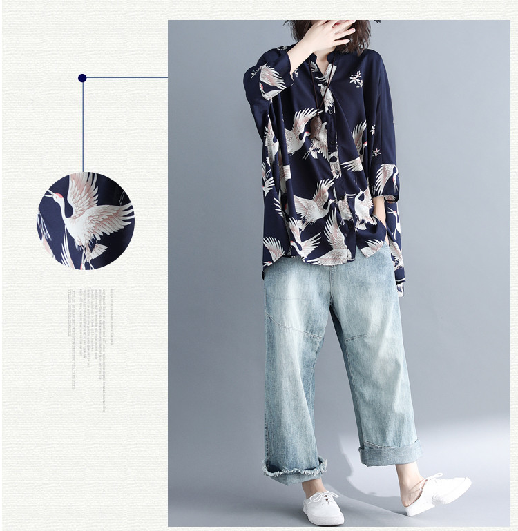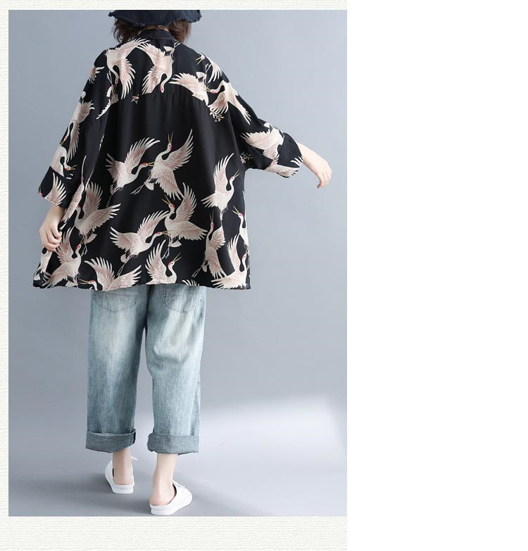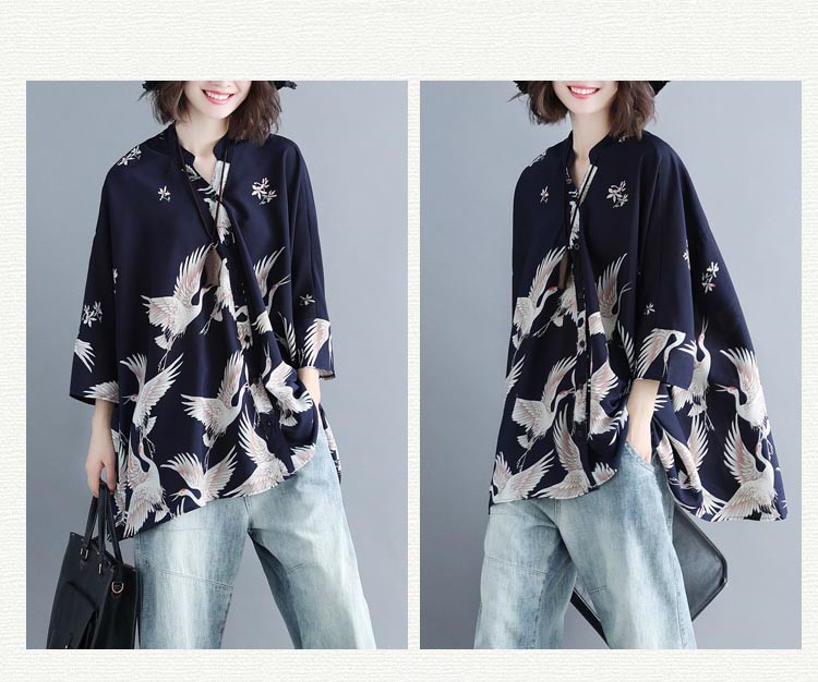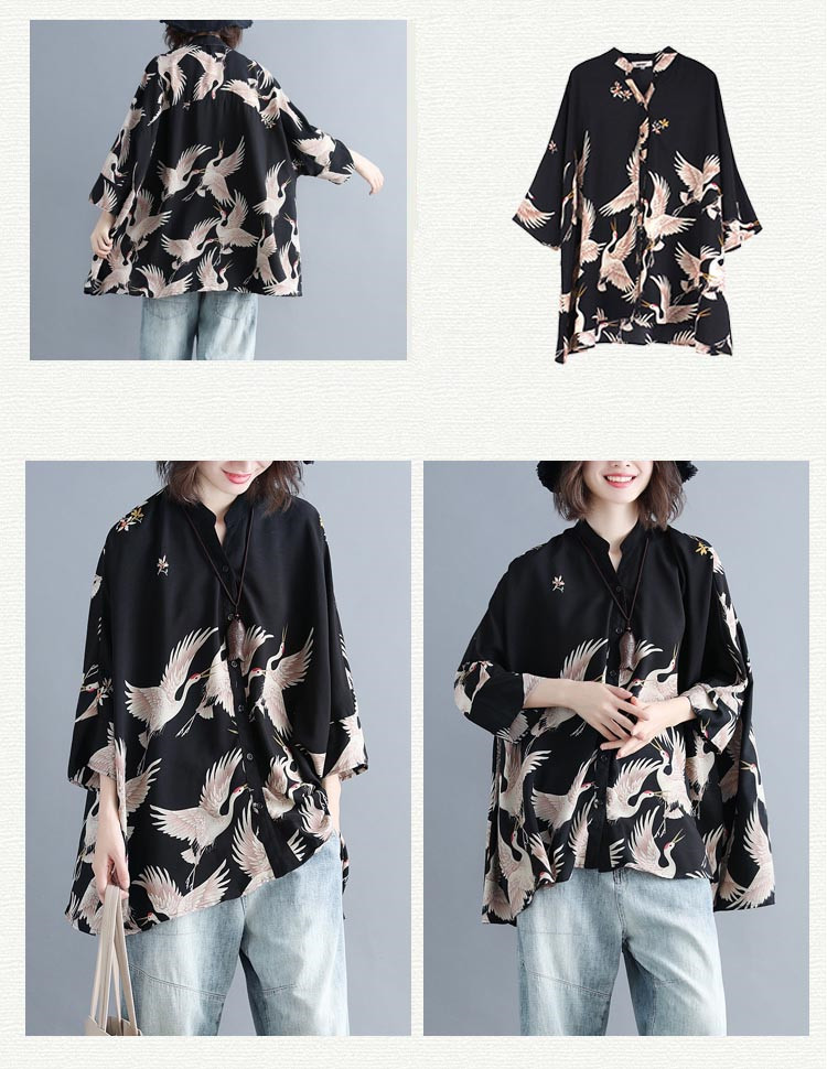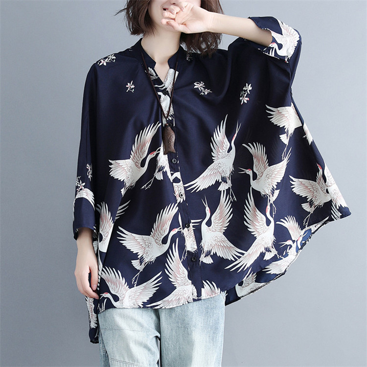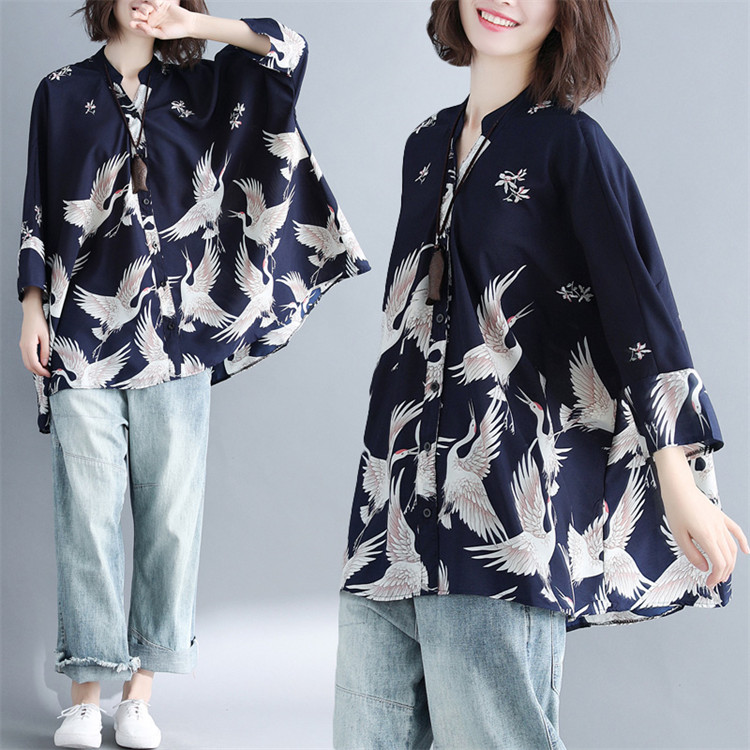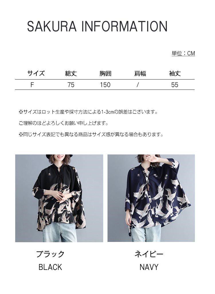 アロハシャツ 七分袖 レディース トップス シャツ シャツブラウス 7分袖 長袖 ビッグサイズ オーバーサイズ 和柄 鶴柄 スキッパーブラウス 羽織 春夏