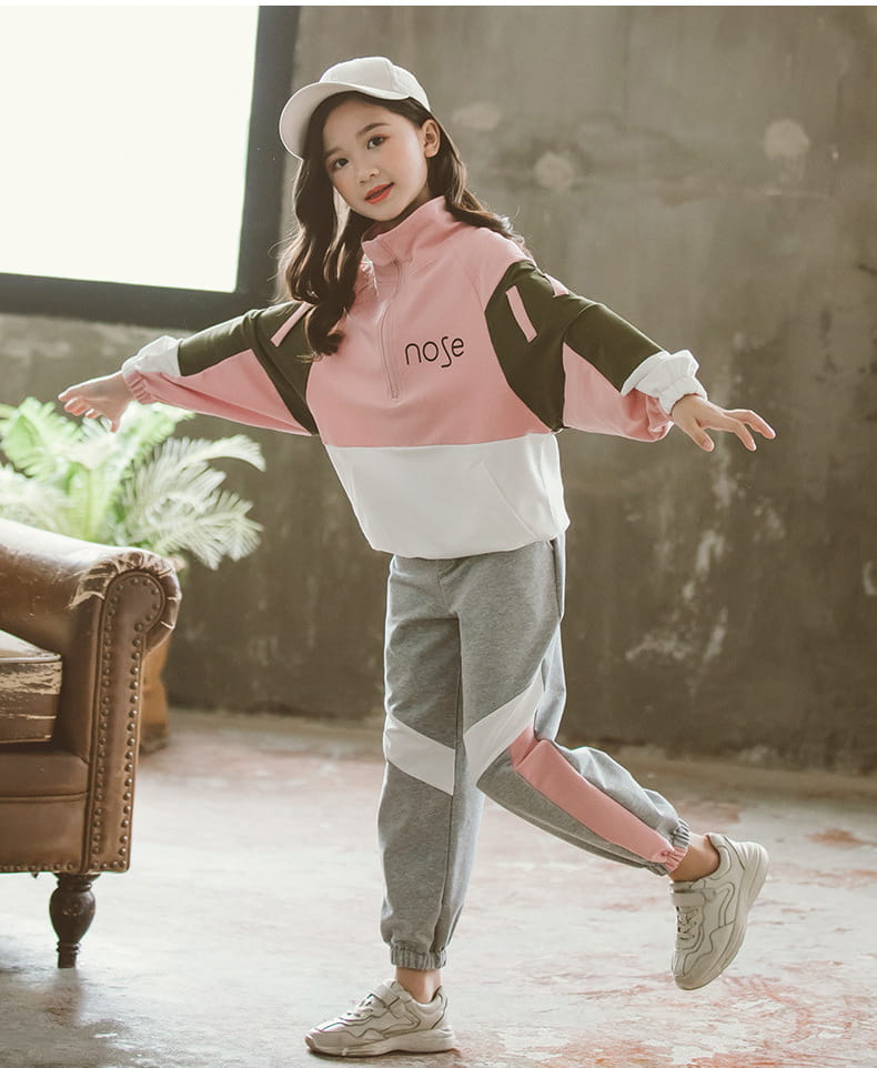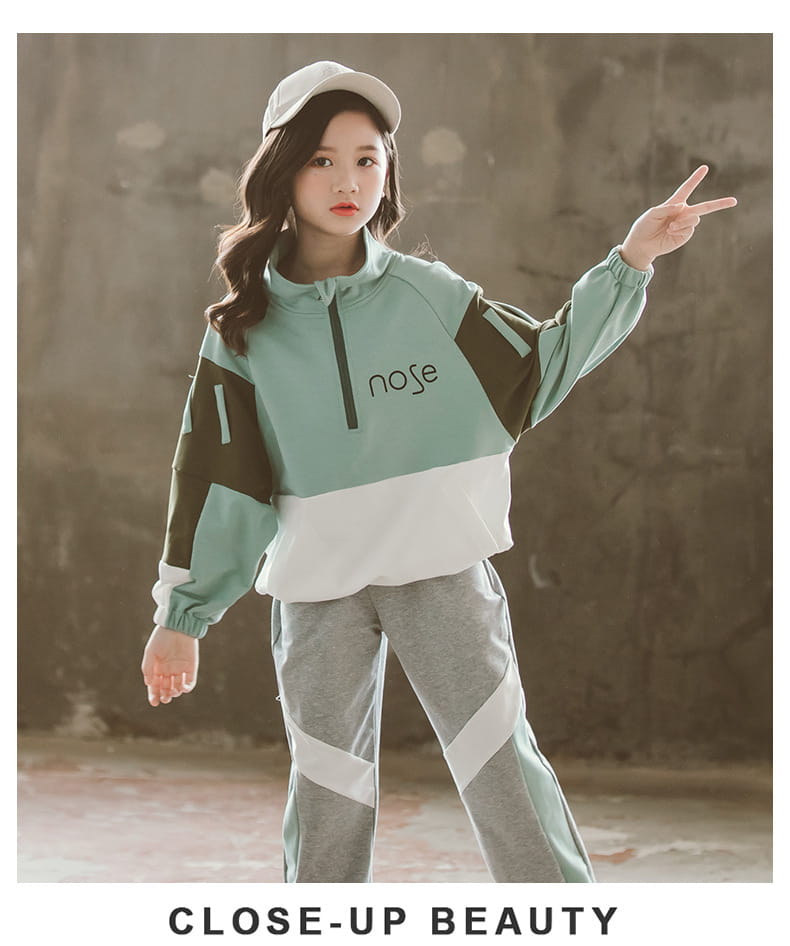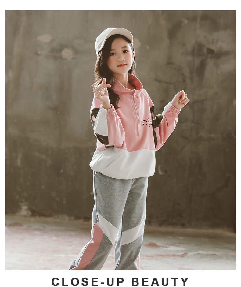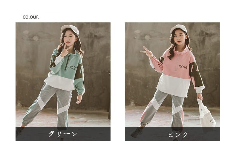 フロントのハーフジップと配色がデザインポイントで、女の子らしい印象を演出します。パーカーの袖口やスウェットパンツの足裾にスッキリとした伸縮性のあるリブ仕立ているので、着用時に引 きずる事が無く、スポーツや運動時のストレス軽減効果が期待出来ます。通園、通学、部活動、ダンスウェア、スポーツウェア、お泊りの時などに も◎クラブやチームでおそろいも◎!