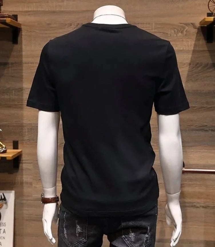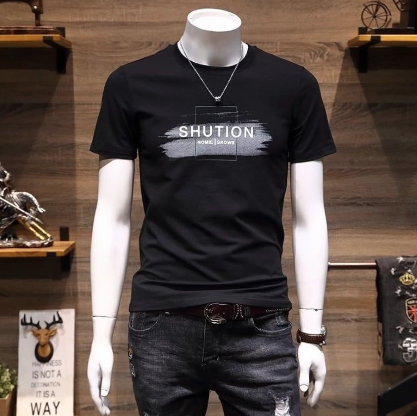 胸元のモノトーンプリントがクールな半袖Tシャツ。