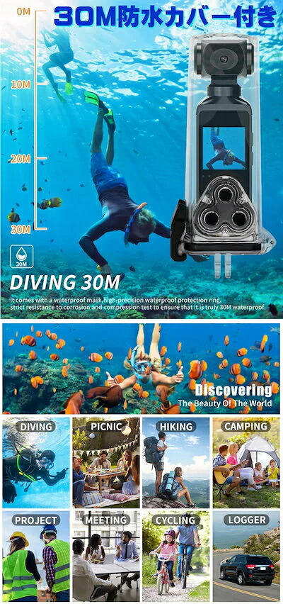 アクションカメラ 4K 30fps 液晶 画面 その場 確認 ウェアラブル 録画 動画 写真 撮影 オールインワン アクション カメラ 防水 カバー 付き 水深 30m バッテリー 内蔵 対応