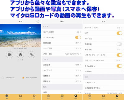 動画:4K/30PFS(3840x2160) 2.7K/30FPS(2688x1520) 1080P/60FPS/30FPS(1920*1080) 720P/120FPS(スロー撮影時)/90FPS/60FPS/30FPS(1280x720)